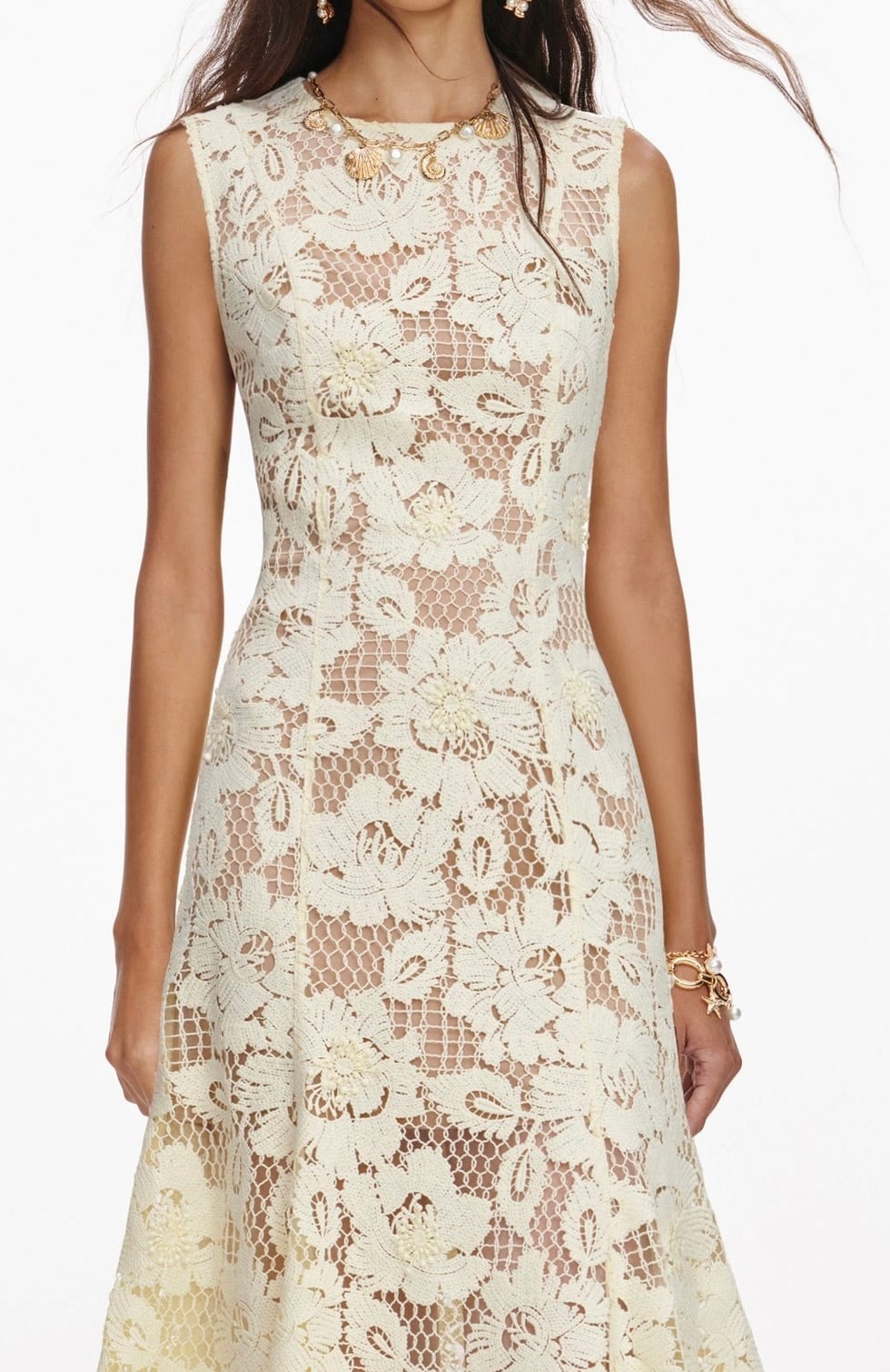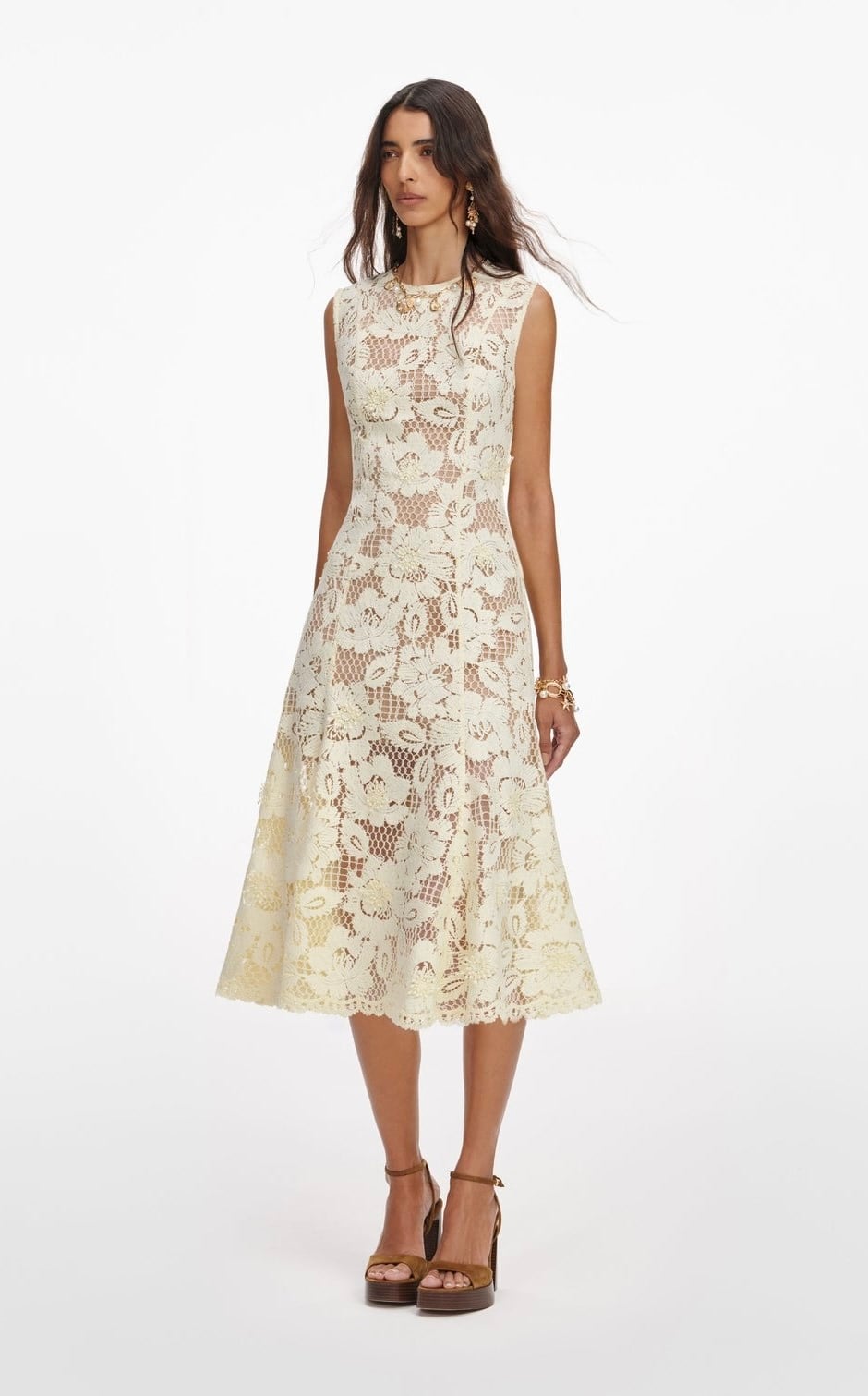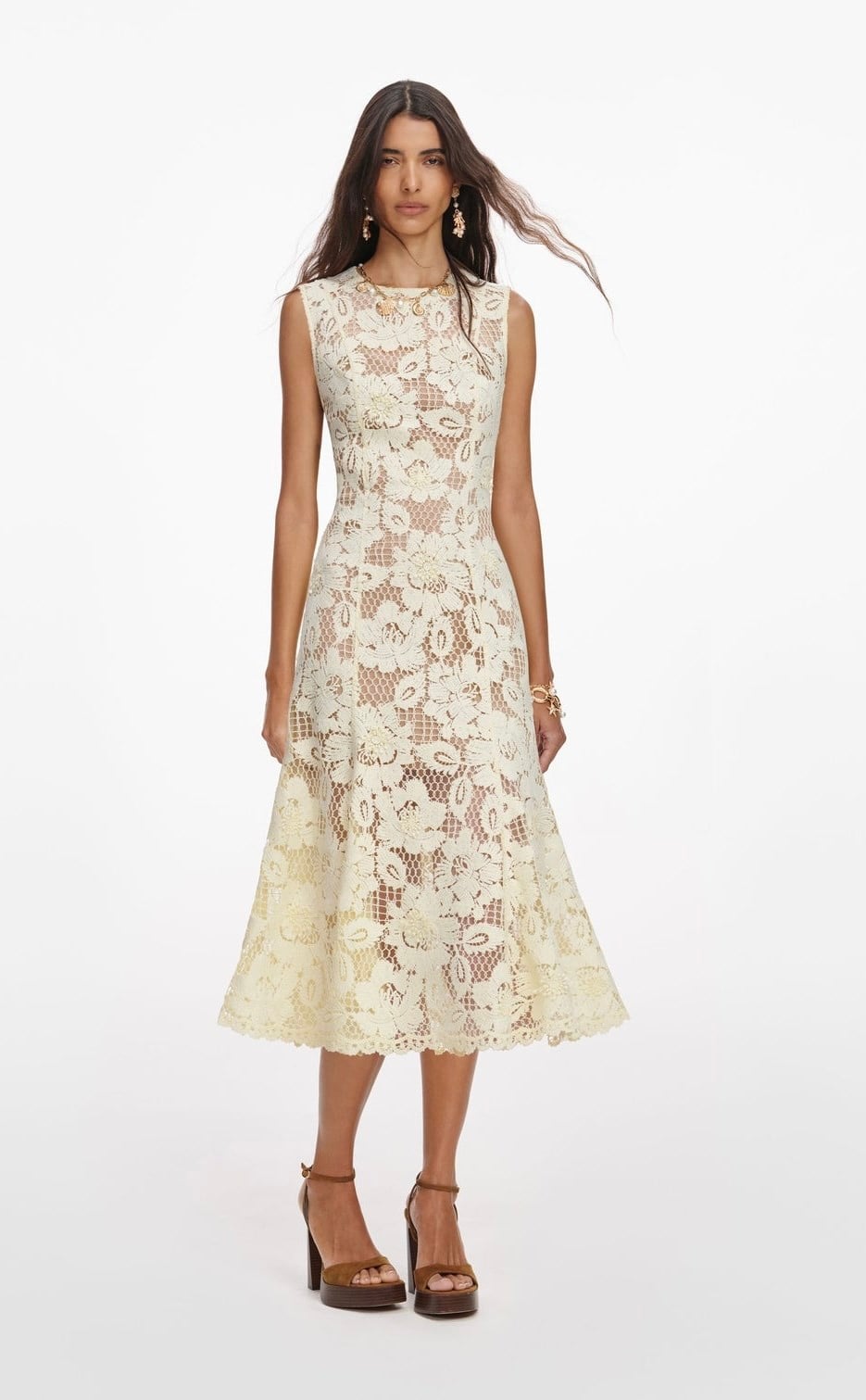 Bisiklet Yaka Astarlı Kurdele Detaylı Midi Boy Sarı Dantel Elbise (DA0003590)