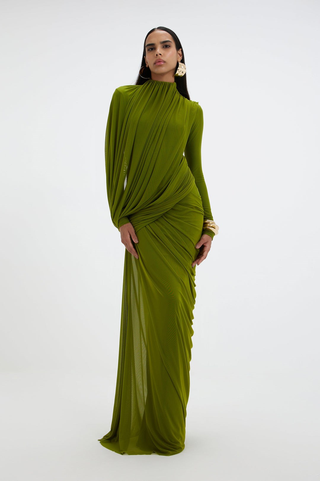 Drapeli Maksi Boy Yeşil Tasarım Elbise (DA0003525)