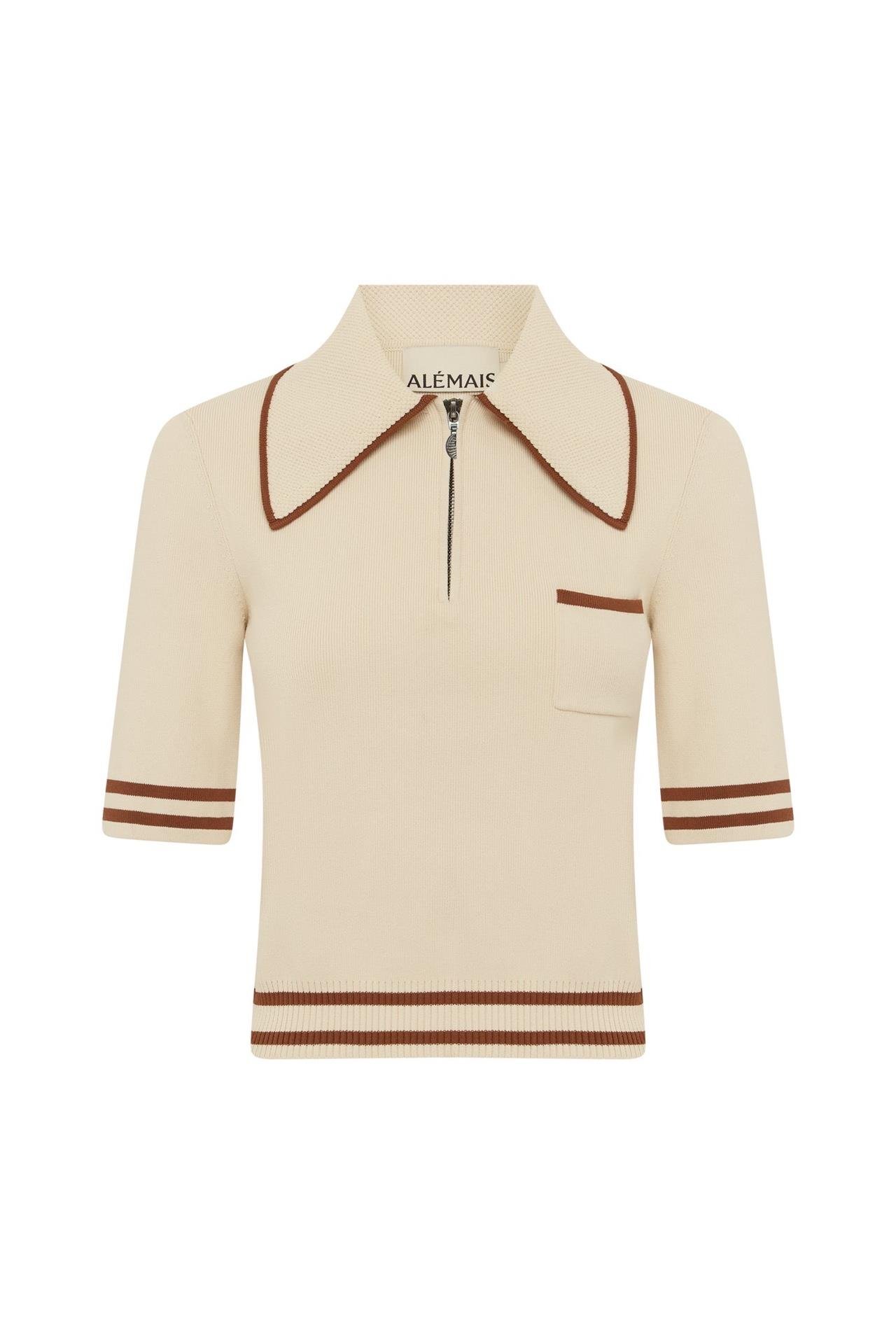 Dik Yakalı Fermuarlı Kahverengi Biyeli Krem Premium Triko Top (DA0002949)