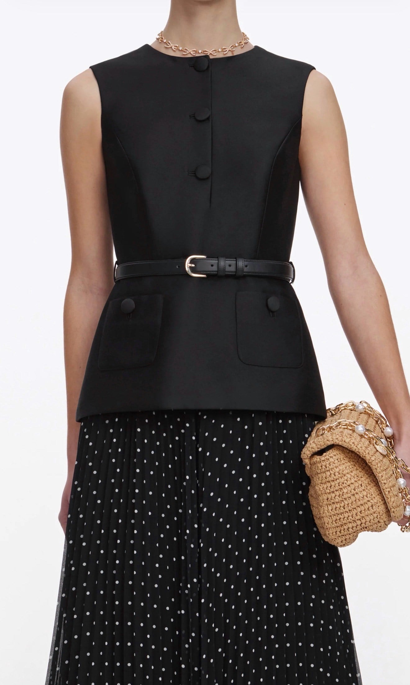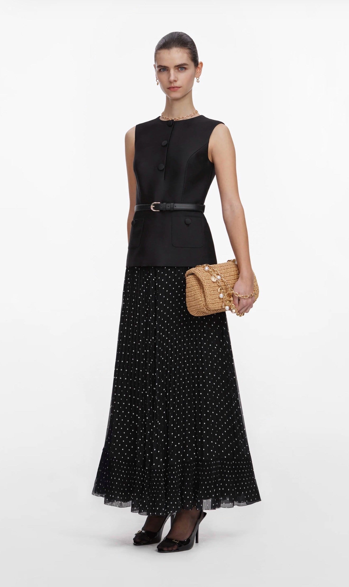 Eteği Puantiyeli Kemerli Siyah Kolsuz Midi Elbise (DA0003505)