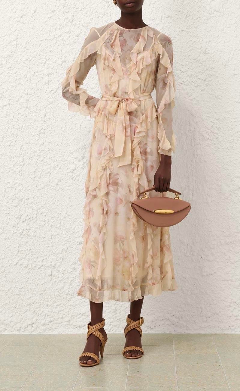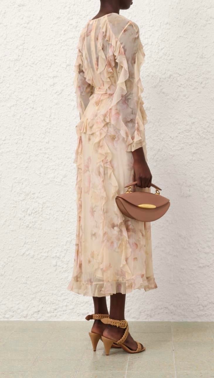 Fırfırlı Çiçek Desenli İpek Premium Midi Elbise (DA0002952)