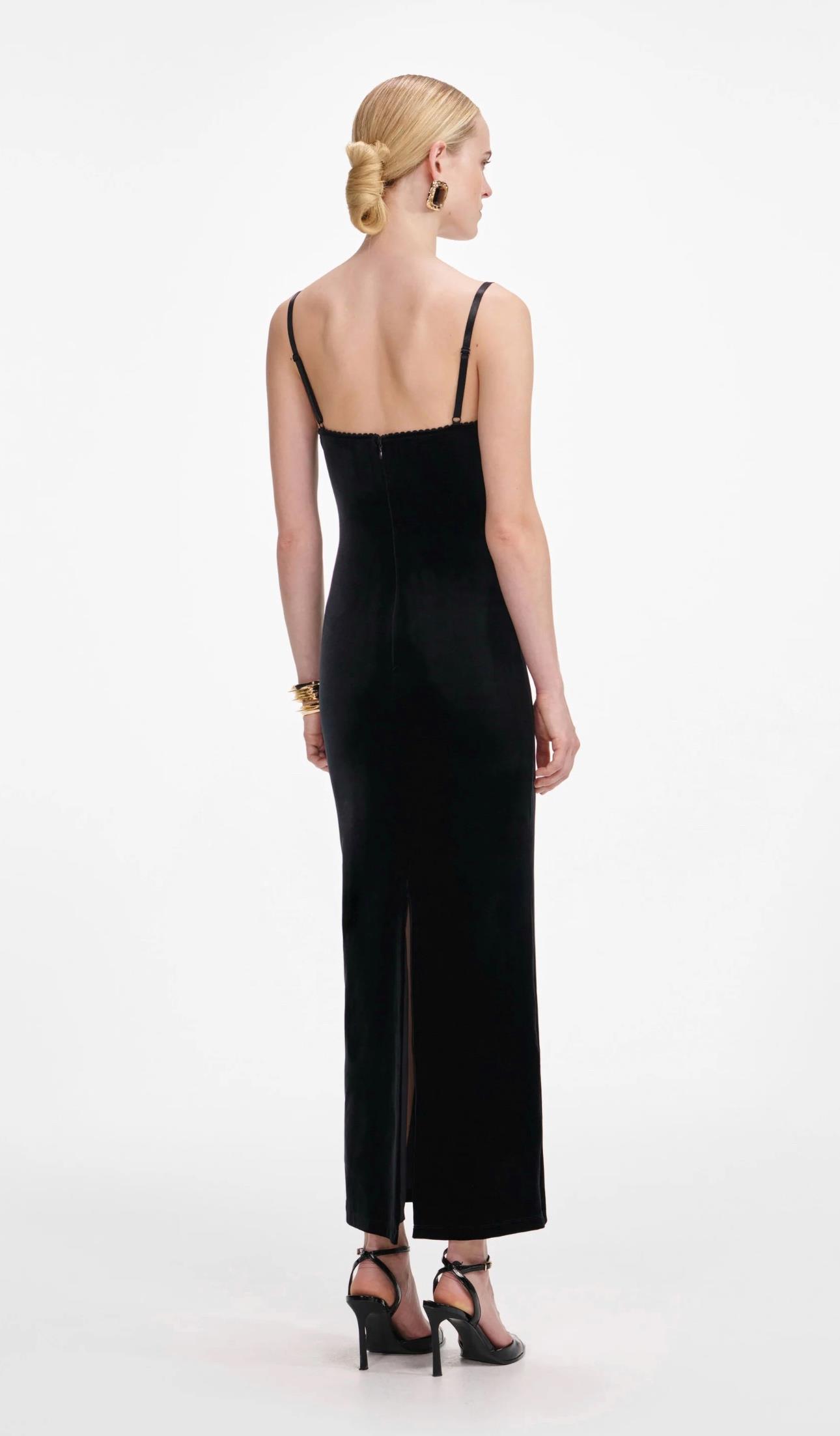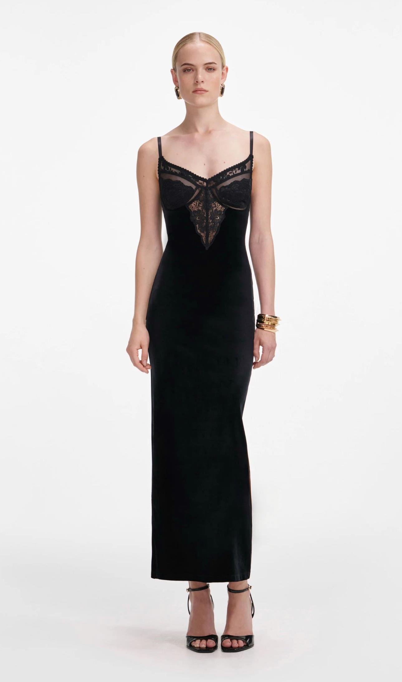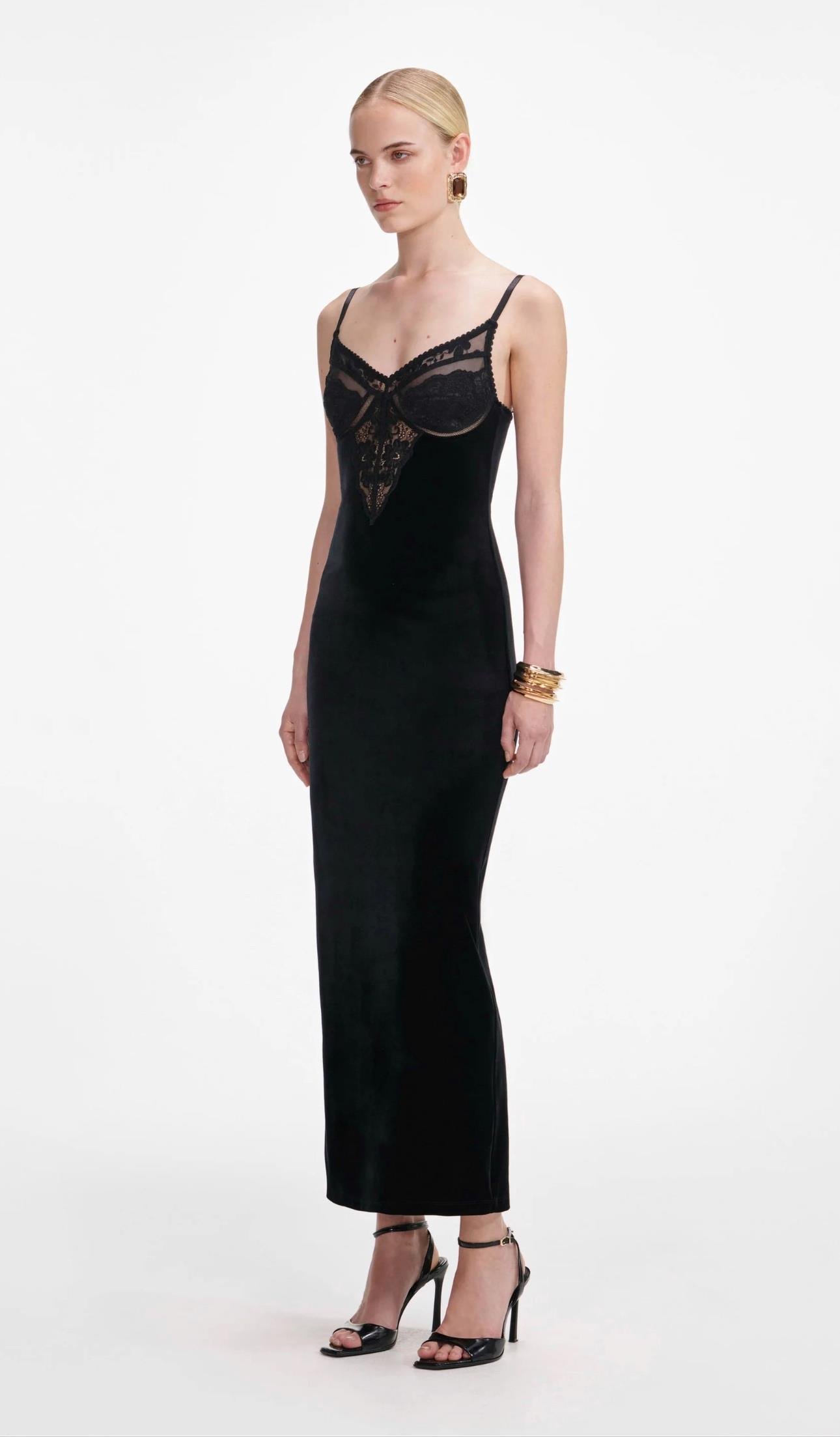 Göğsü Dantel Detaylı Askılı Siyah Premium Midi Elbise (DA0002968)
