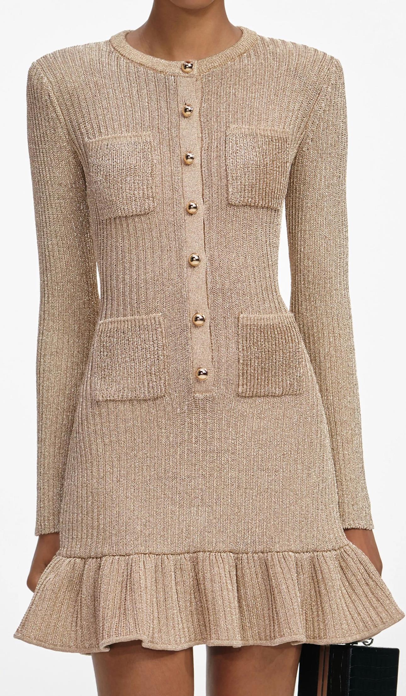 Gold Düğmeli Cepli Kendinden Simli Triko Tasarım Mini Elbise (DA0002966)