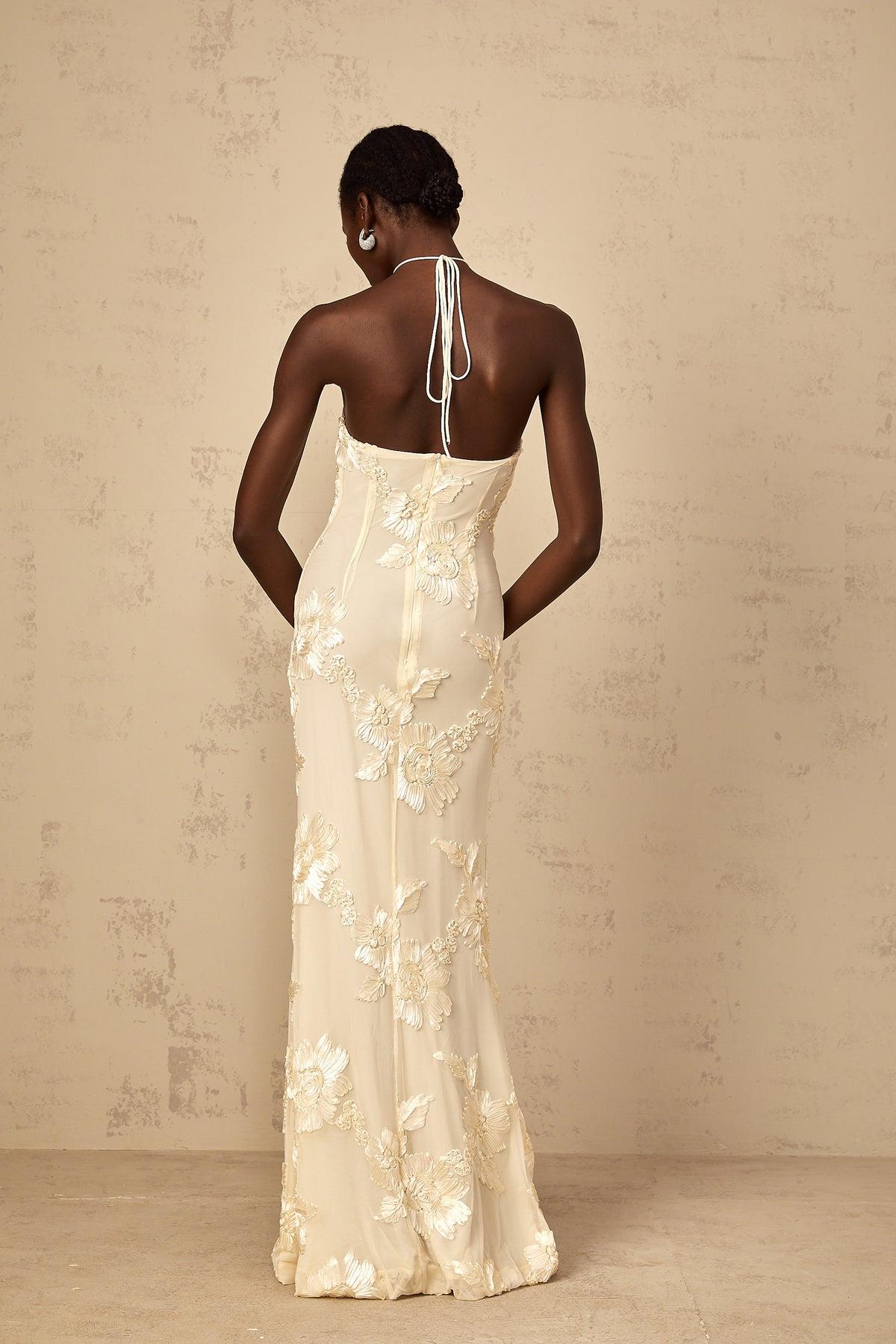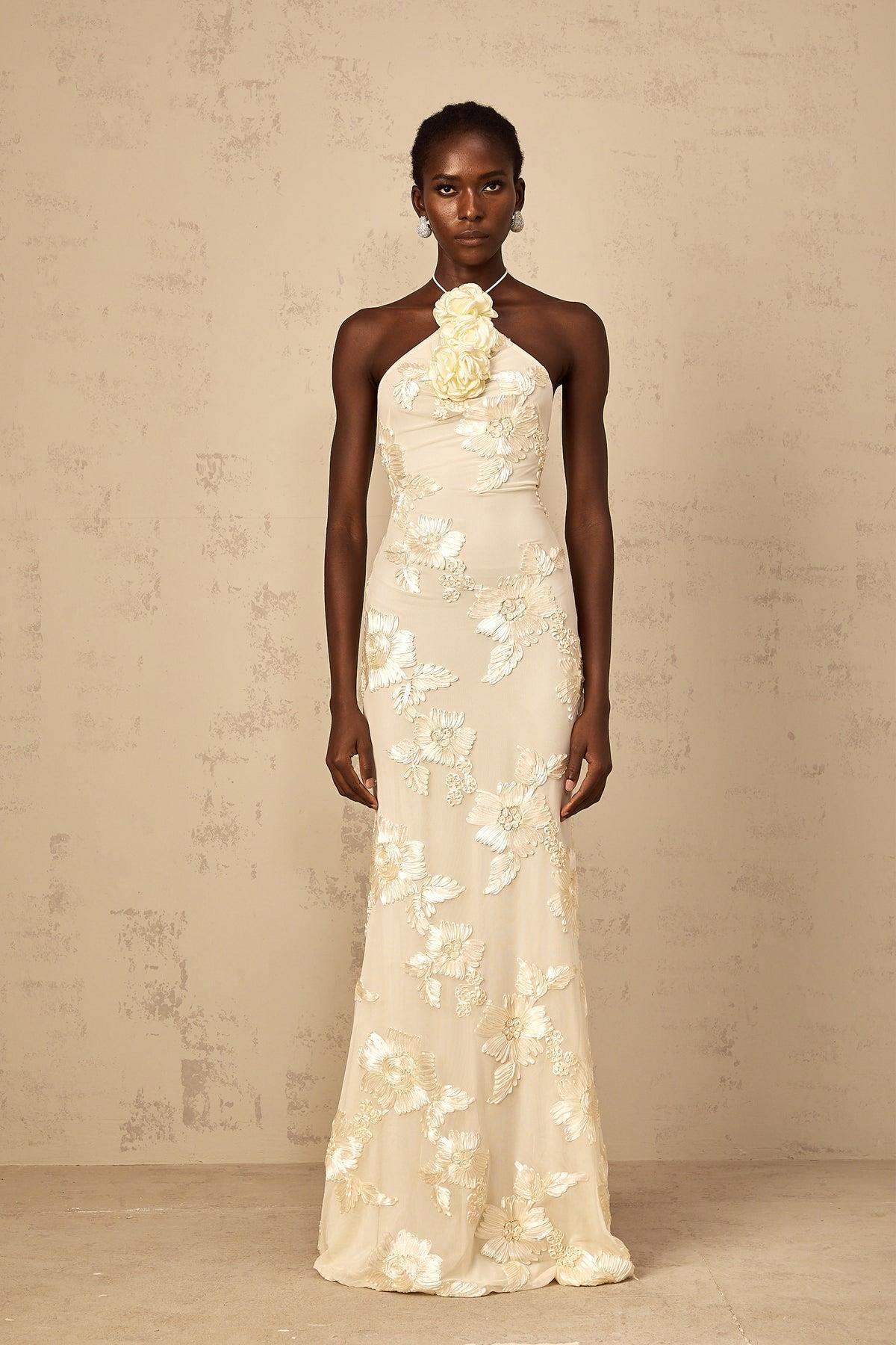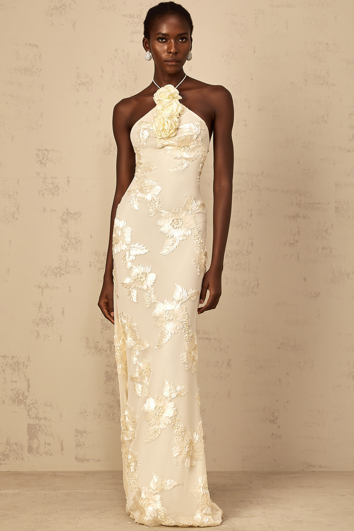Gül Detaylı Boyundan Bağlamalı Midi Krem Rengi Elbisee (DA0003041)