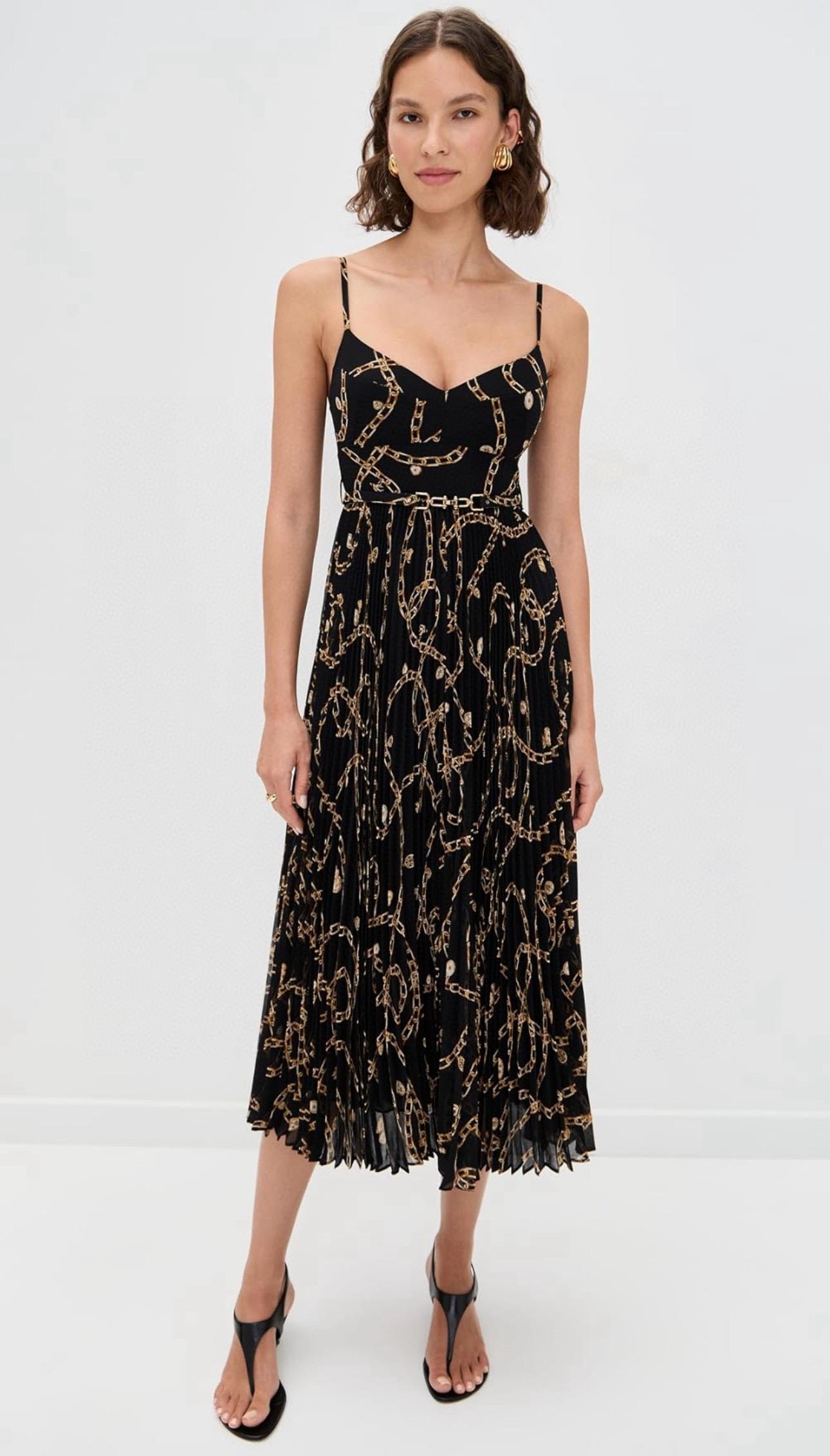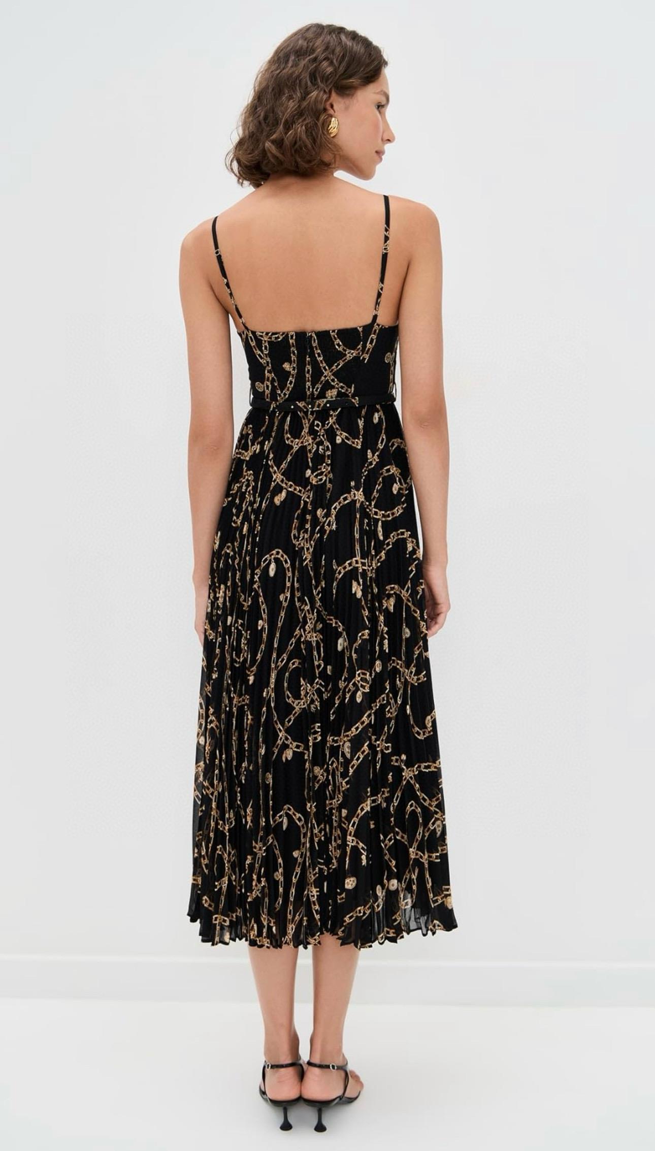 İp Askılı Zincir Desenli Pileli Premium Midi Siyah Elbise (DA0002943)