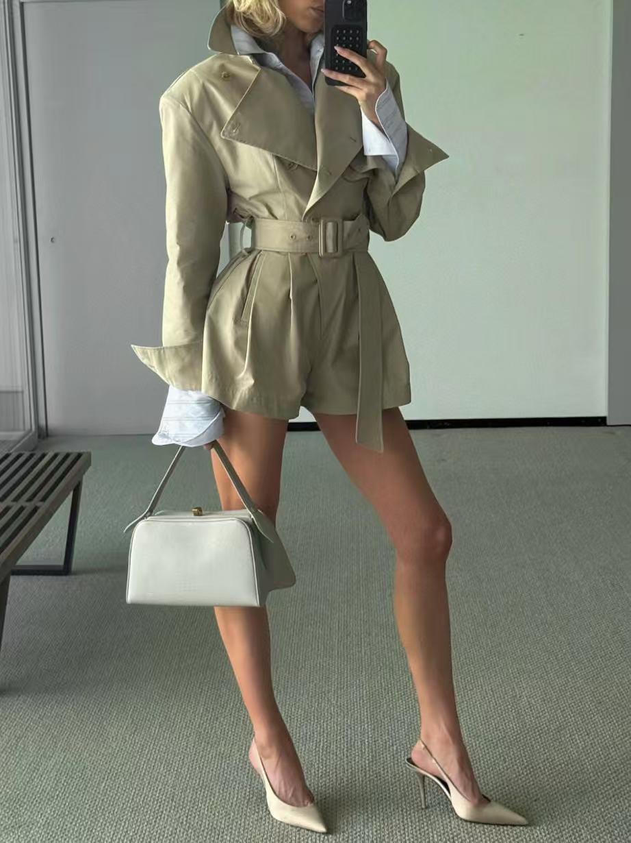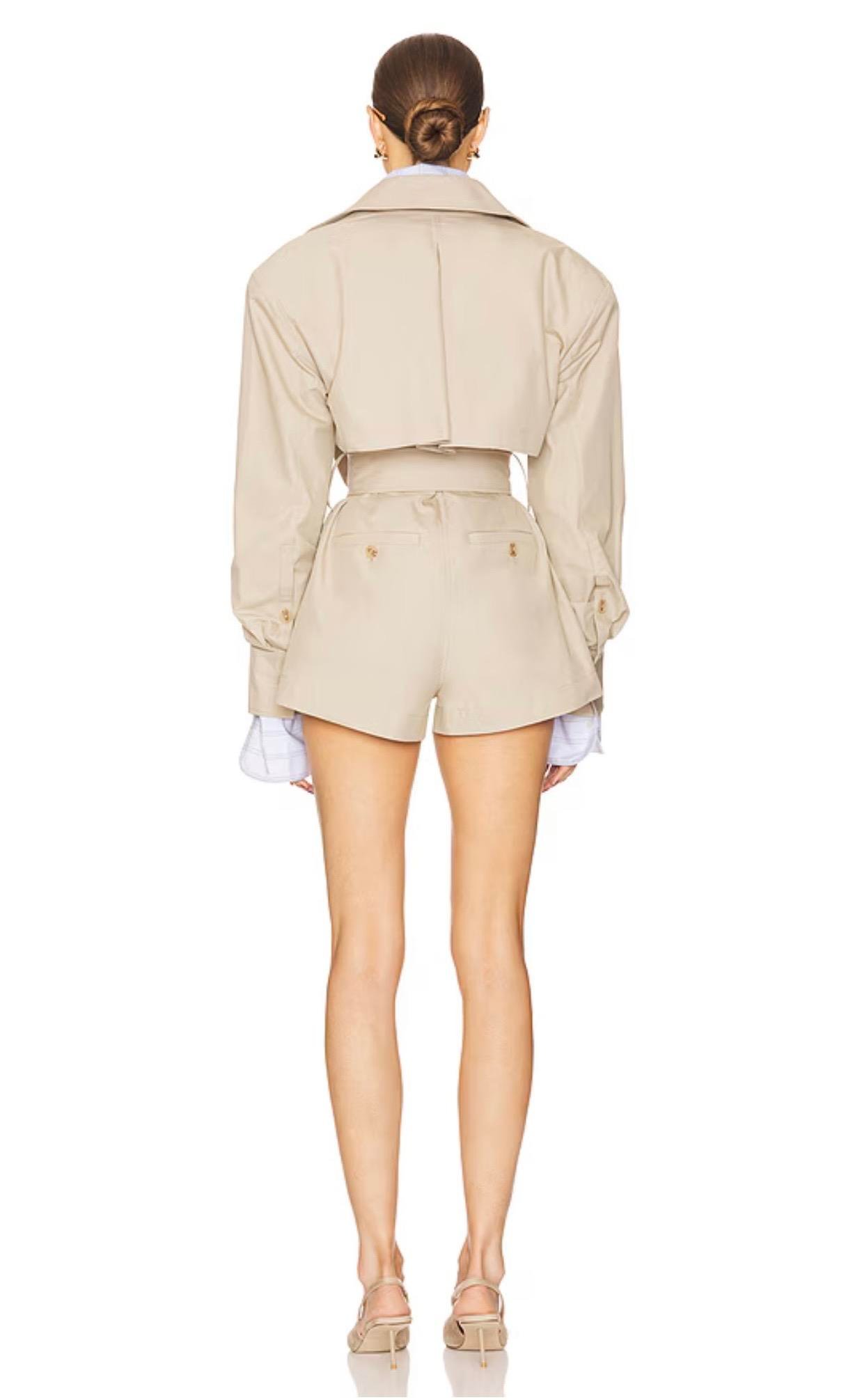 Kemerli Trench Görünümlü Premium Mini Bej Tulum (DA0002977)