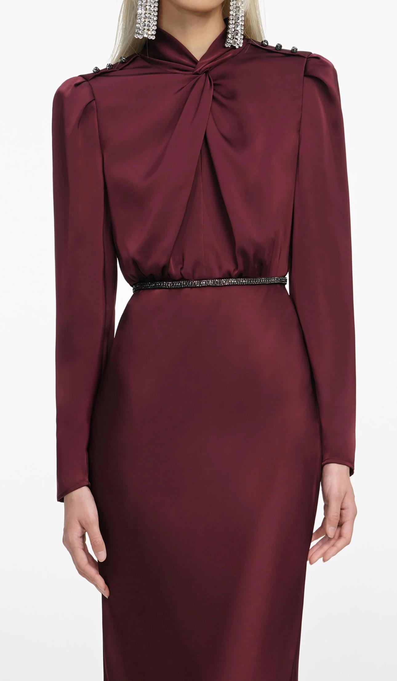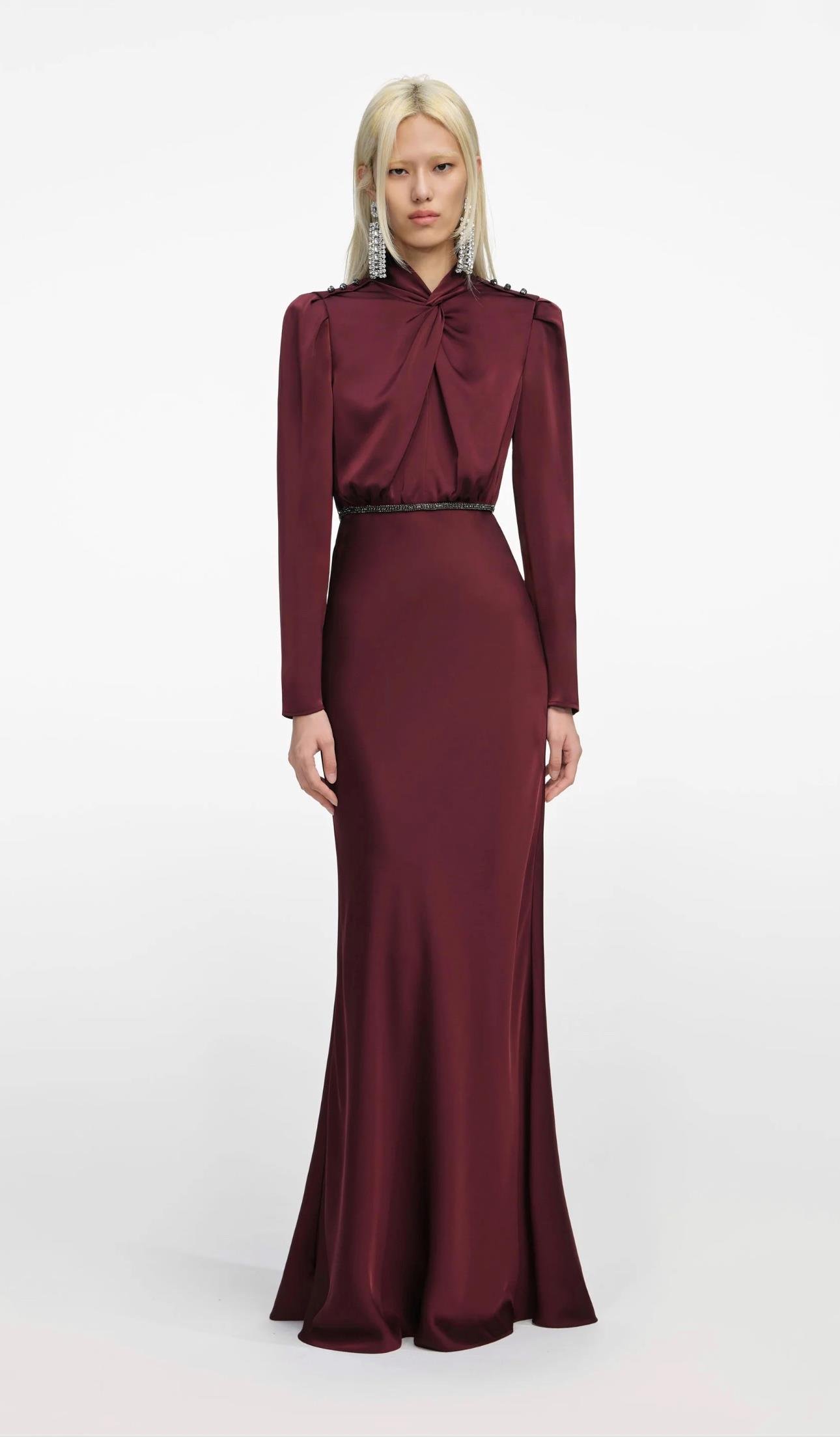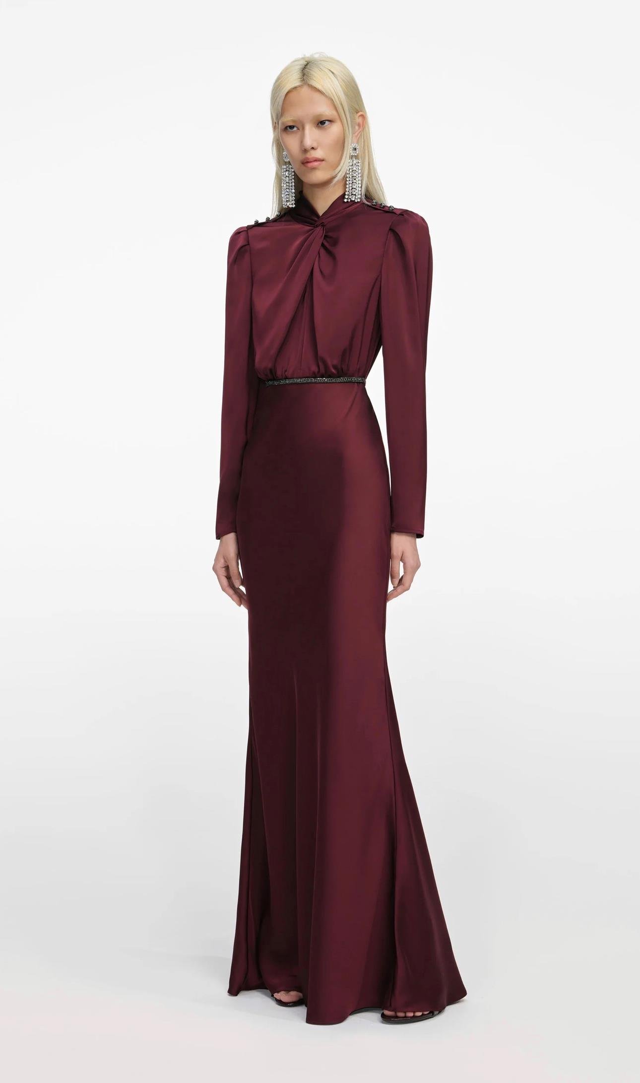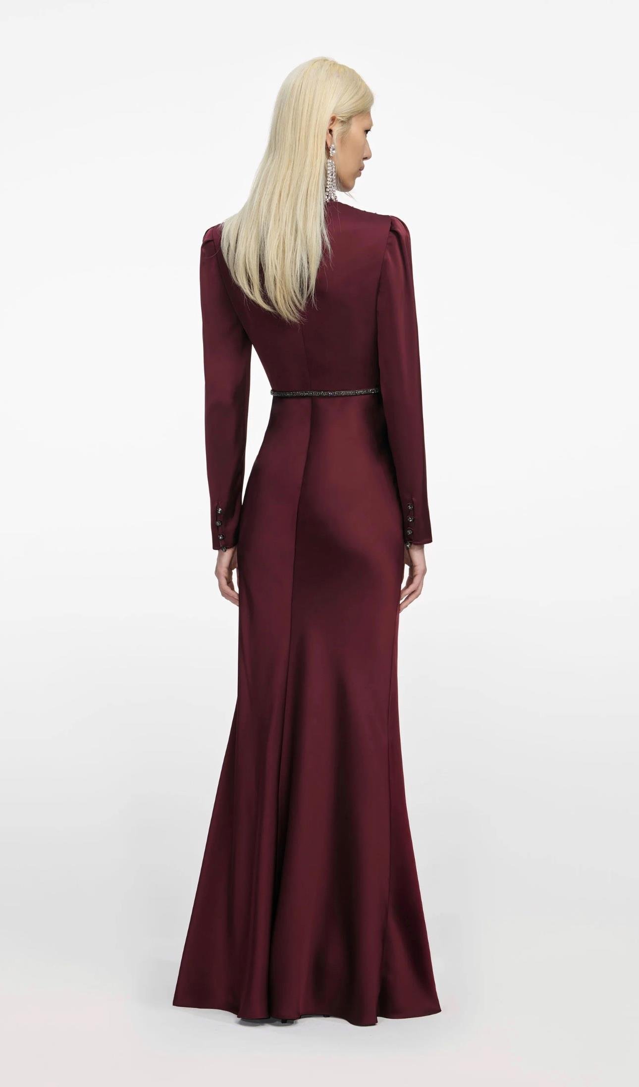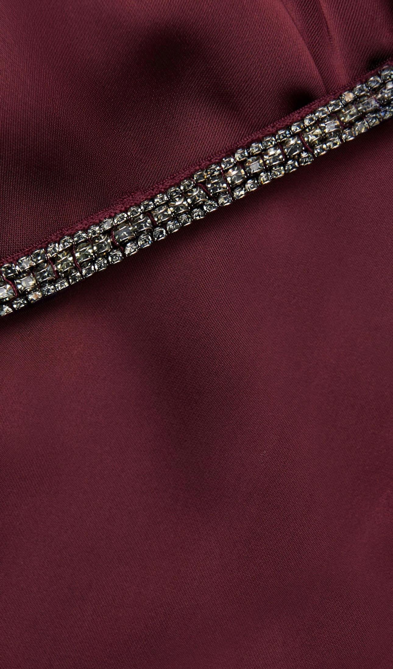 Kristal Kemerli Vatkalı Bordo Premium Maksi Elbise (DA0002962)