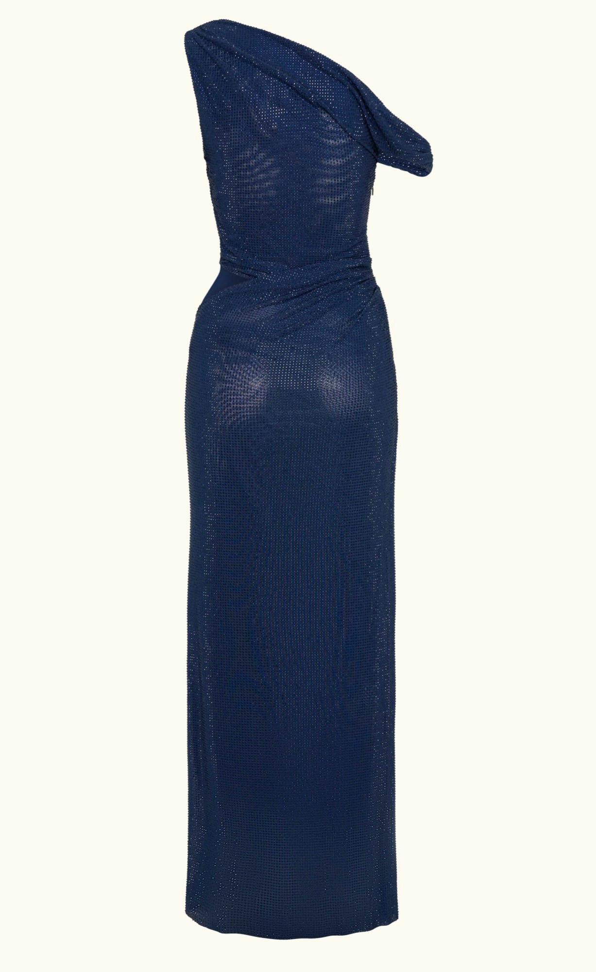 Kristal Taşlı Bel Detaylı Maksi Tasarım Lacivert Elbise (DA0002995)