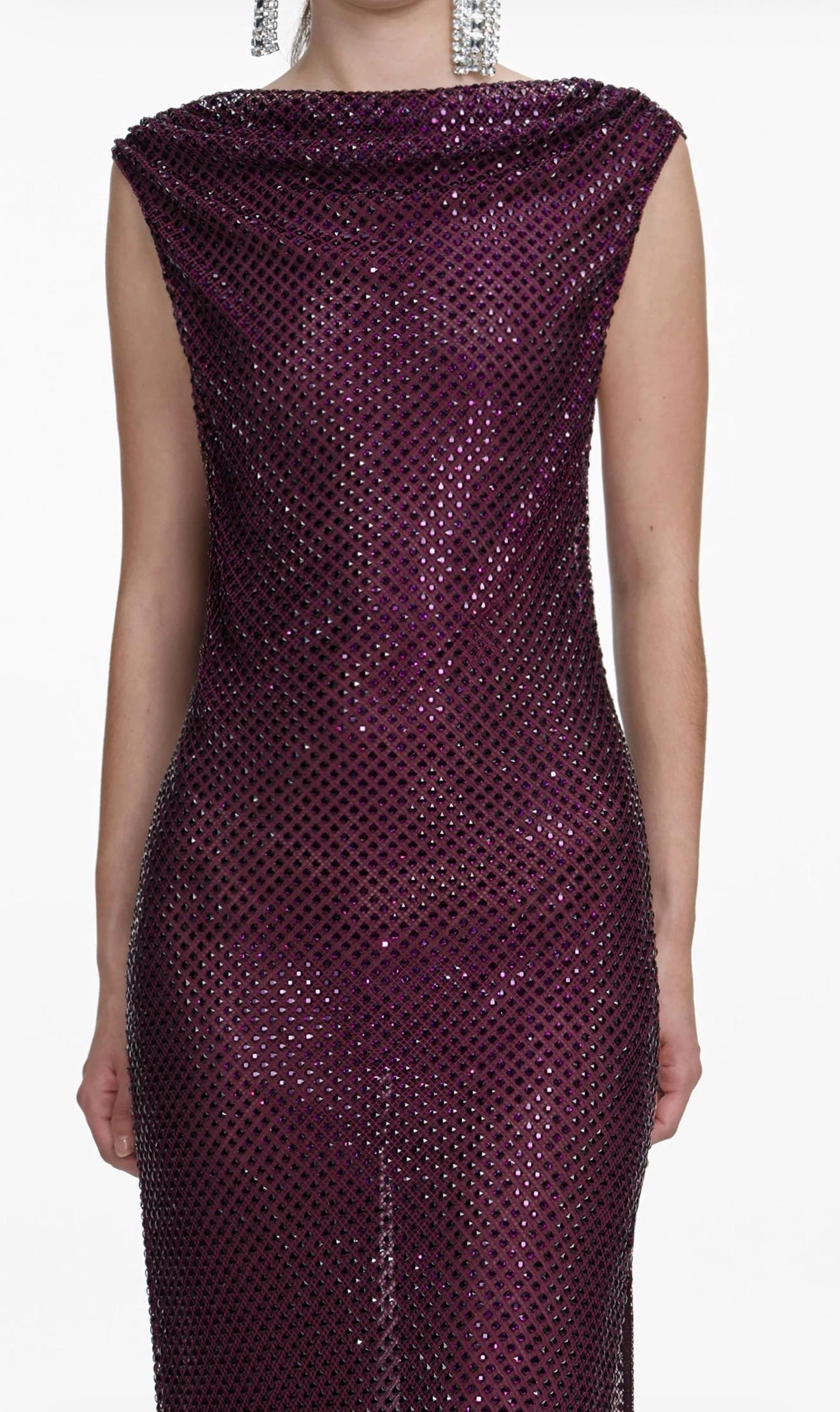 Kristal Taşlı Sırtı Dekolteli Yırtmaçlı Mürdüm Maksi Premium Elbise (DA0003167)