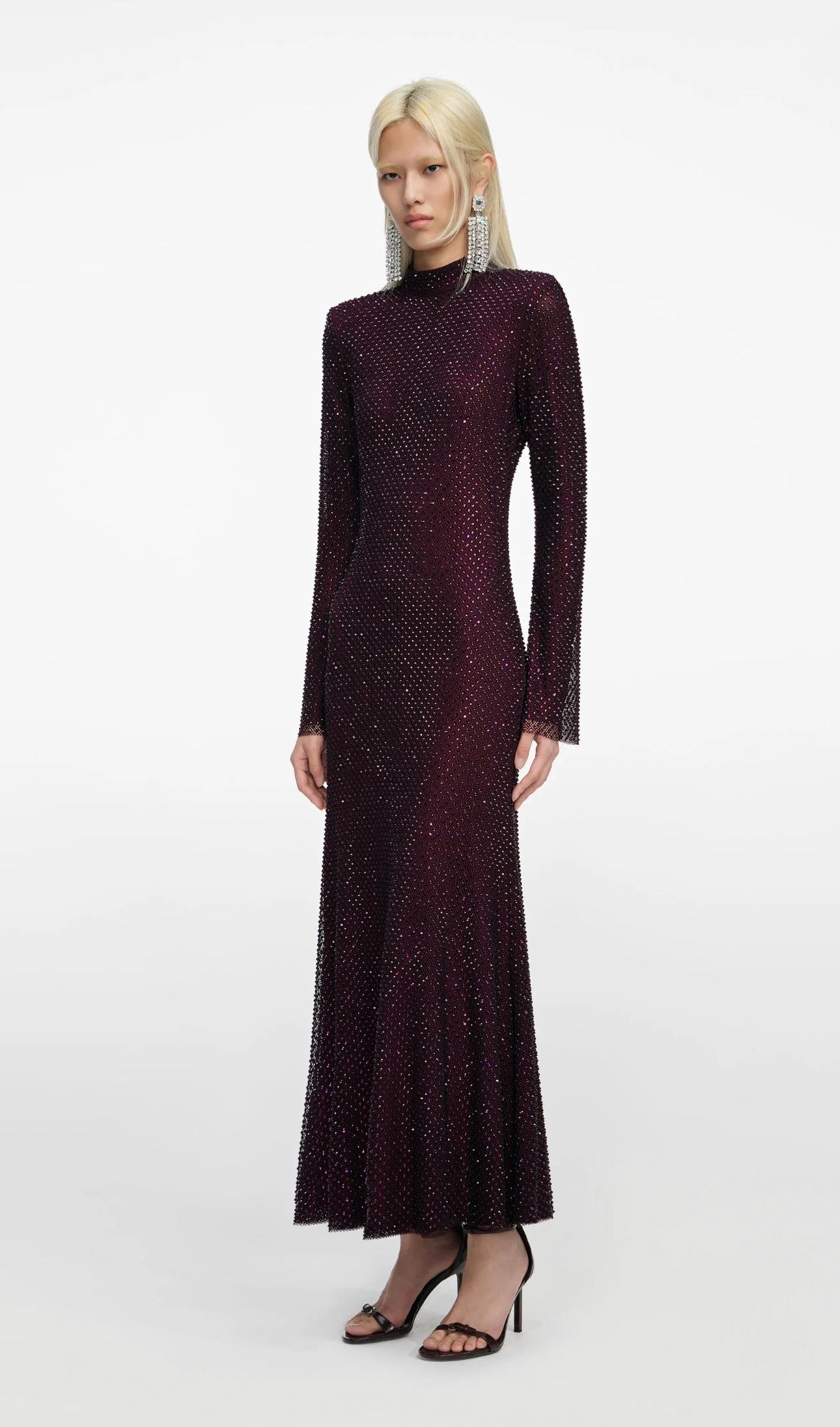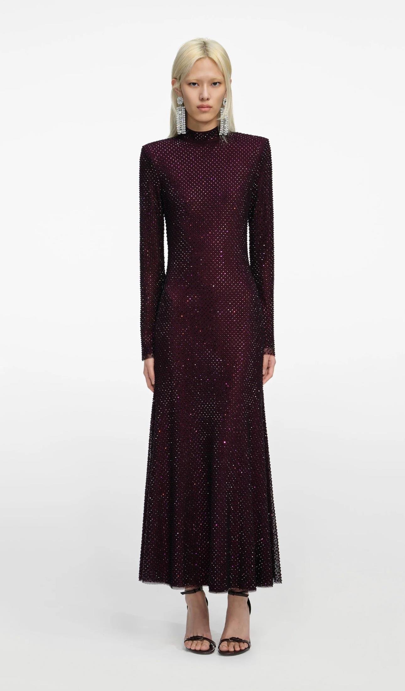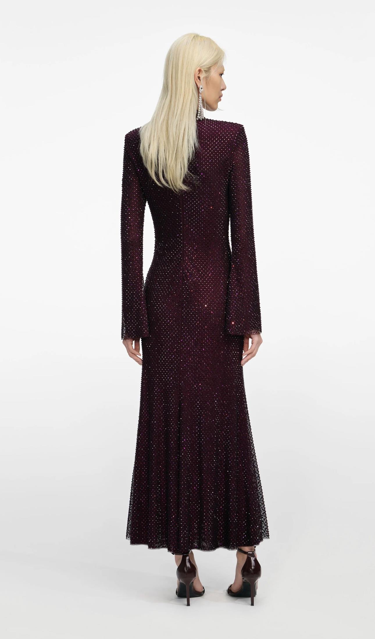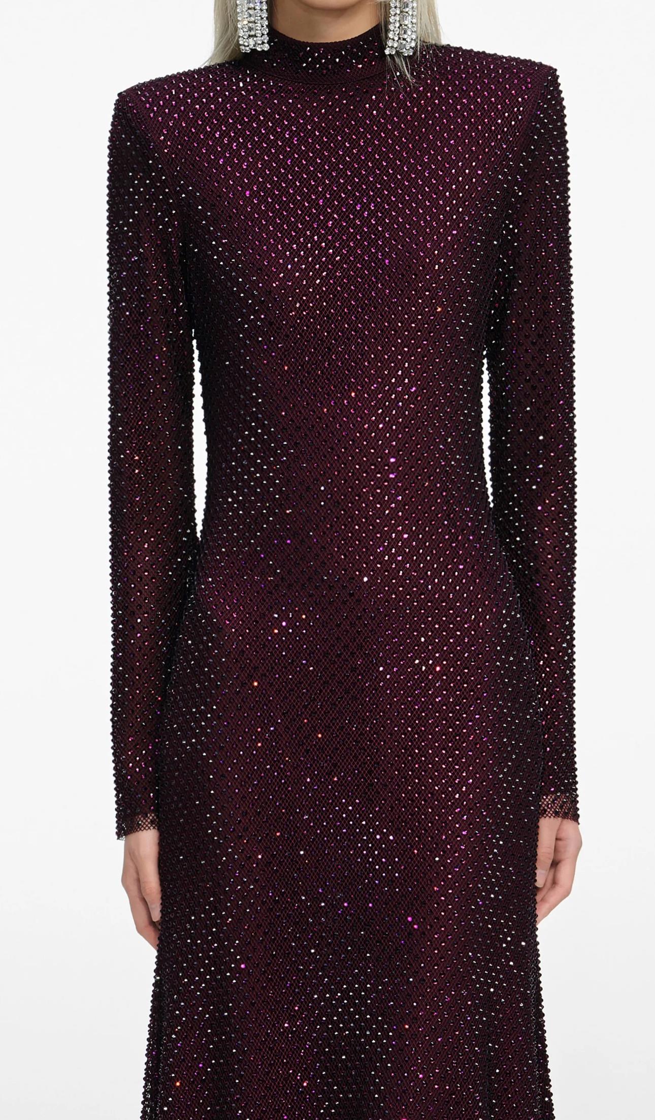 Kristal Taşlı Vatkalı Uzun Kollu Bordo Premium Midi Elbise (DA0002960)