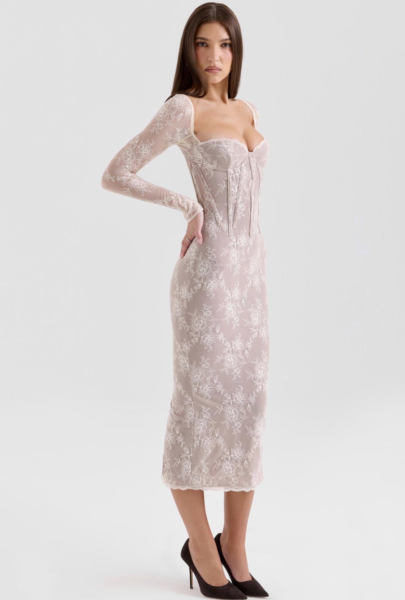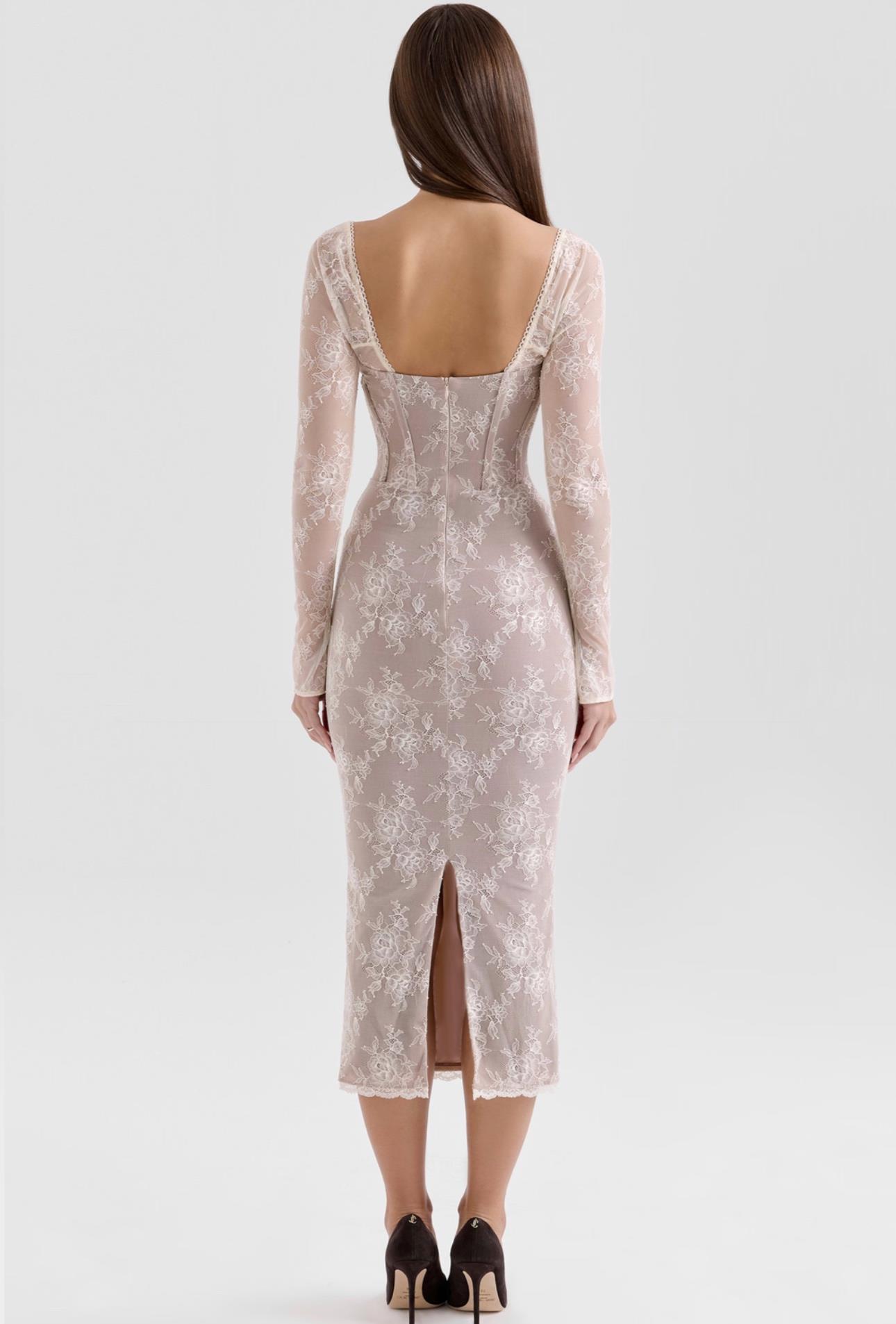 Kuplu Uzun Kollu Dantel Midi Beyaz Elbise (DA0002981)