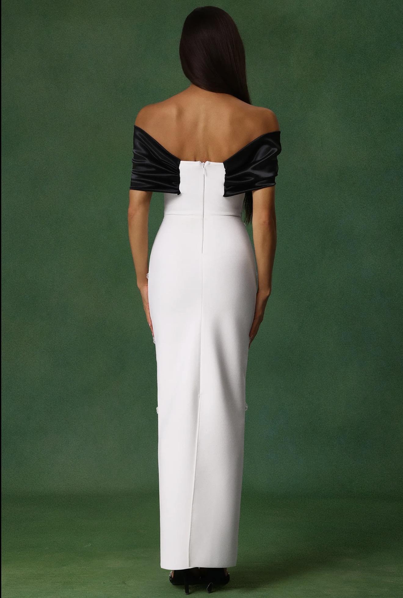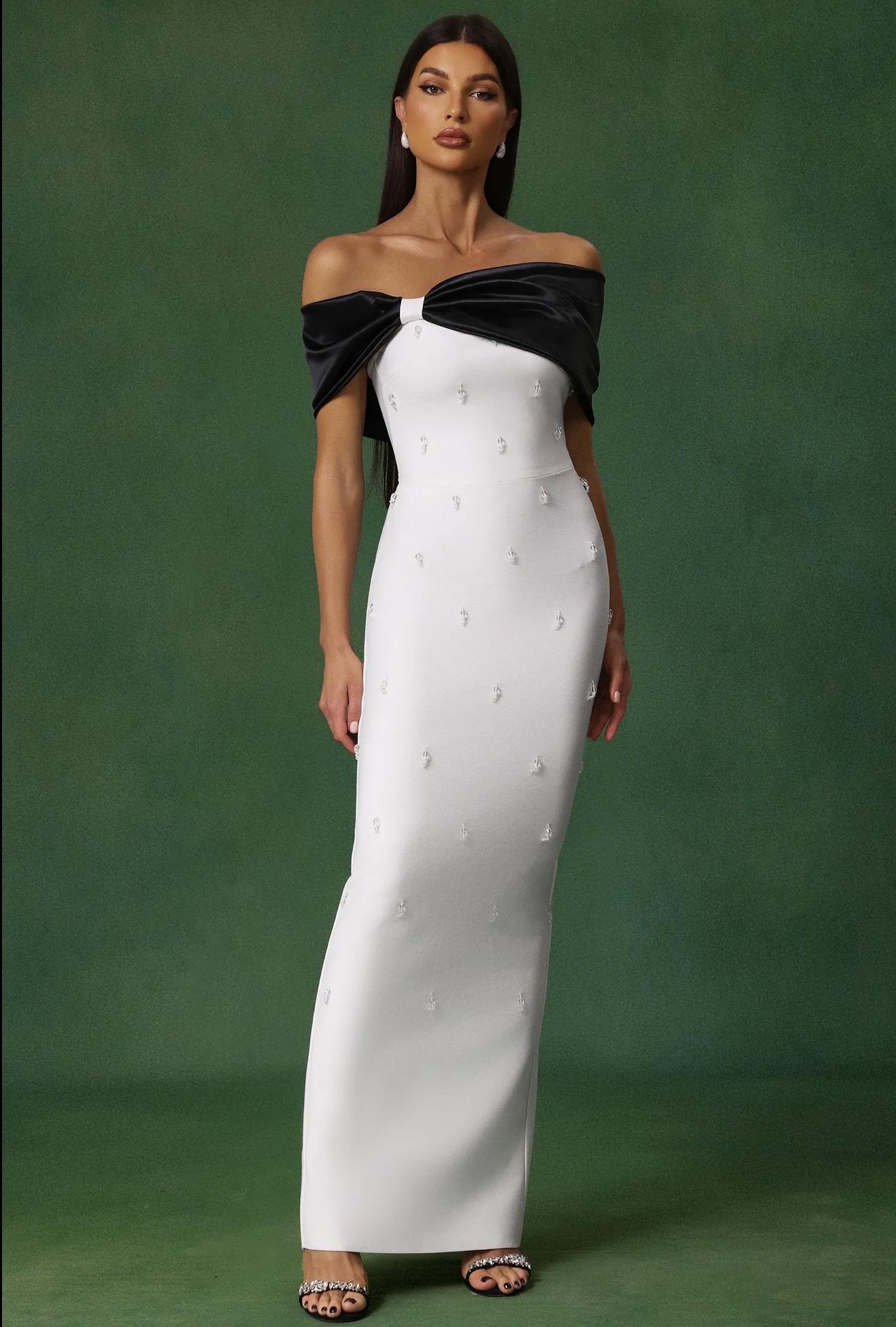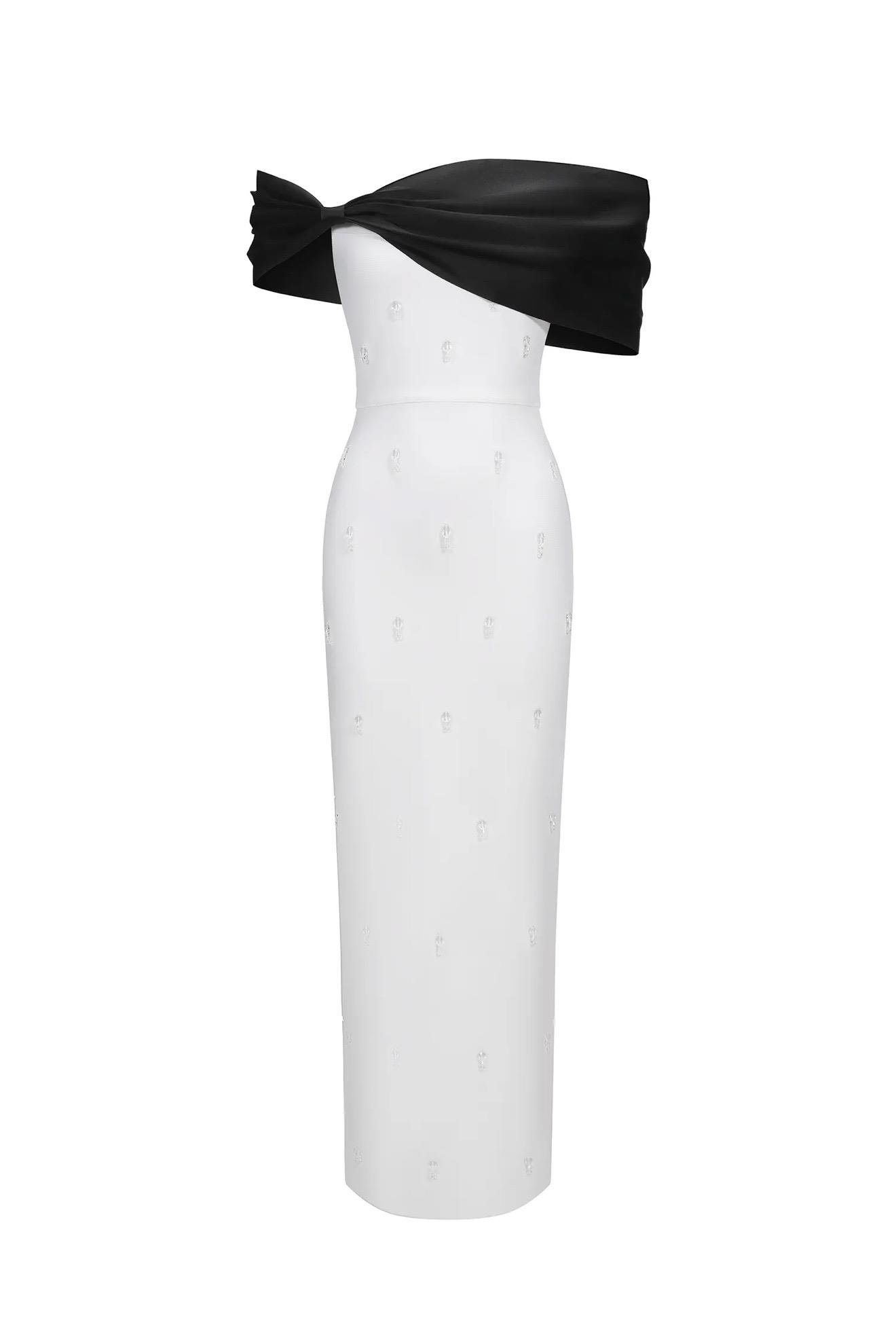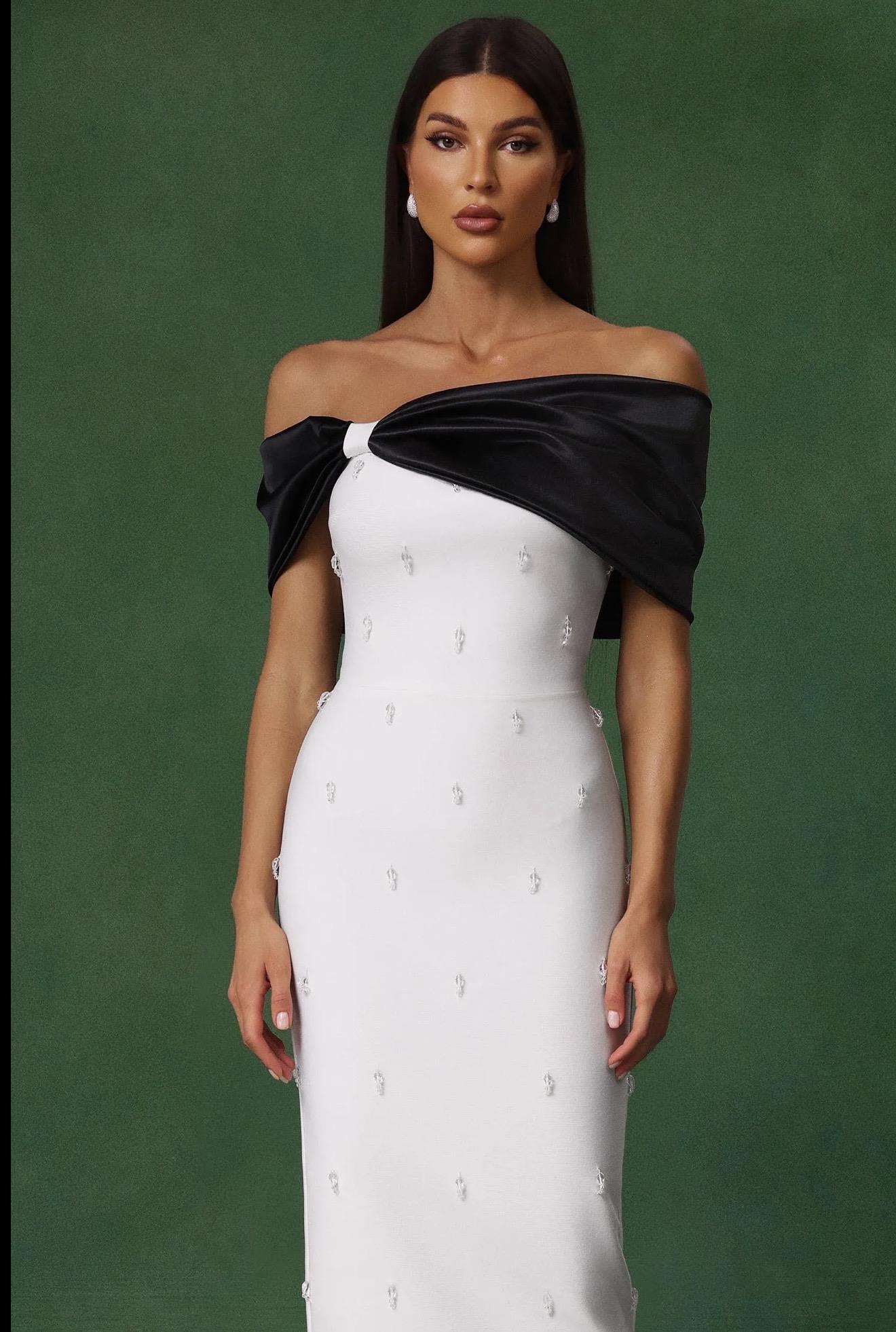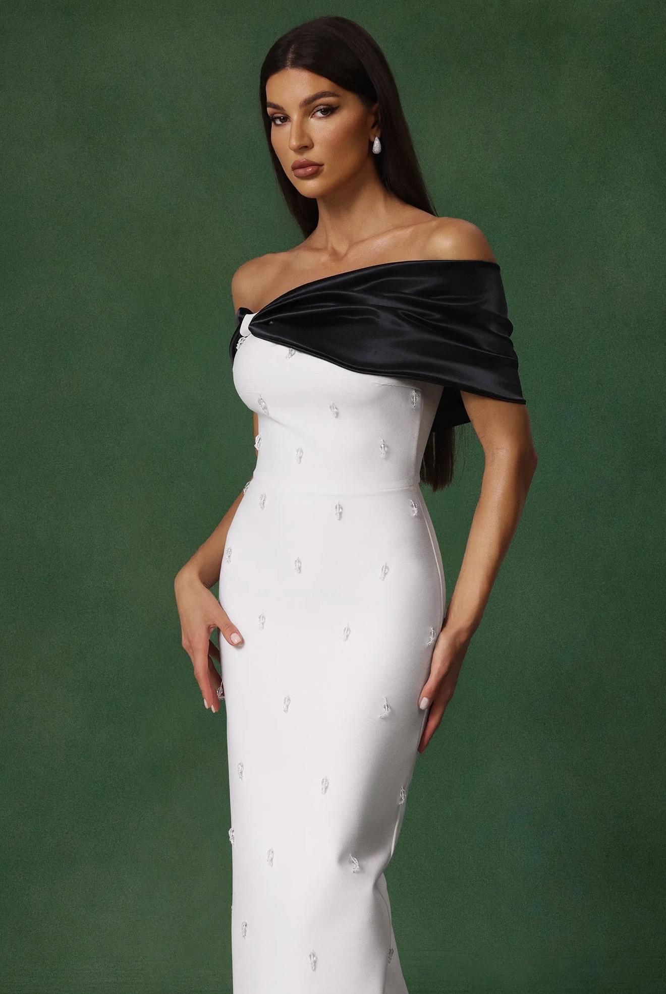 Omzu Kurdele Detaylı Kristal Taşlı Beyaz Midi Tasarım Elbise (DA0003031)