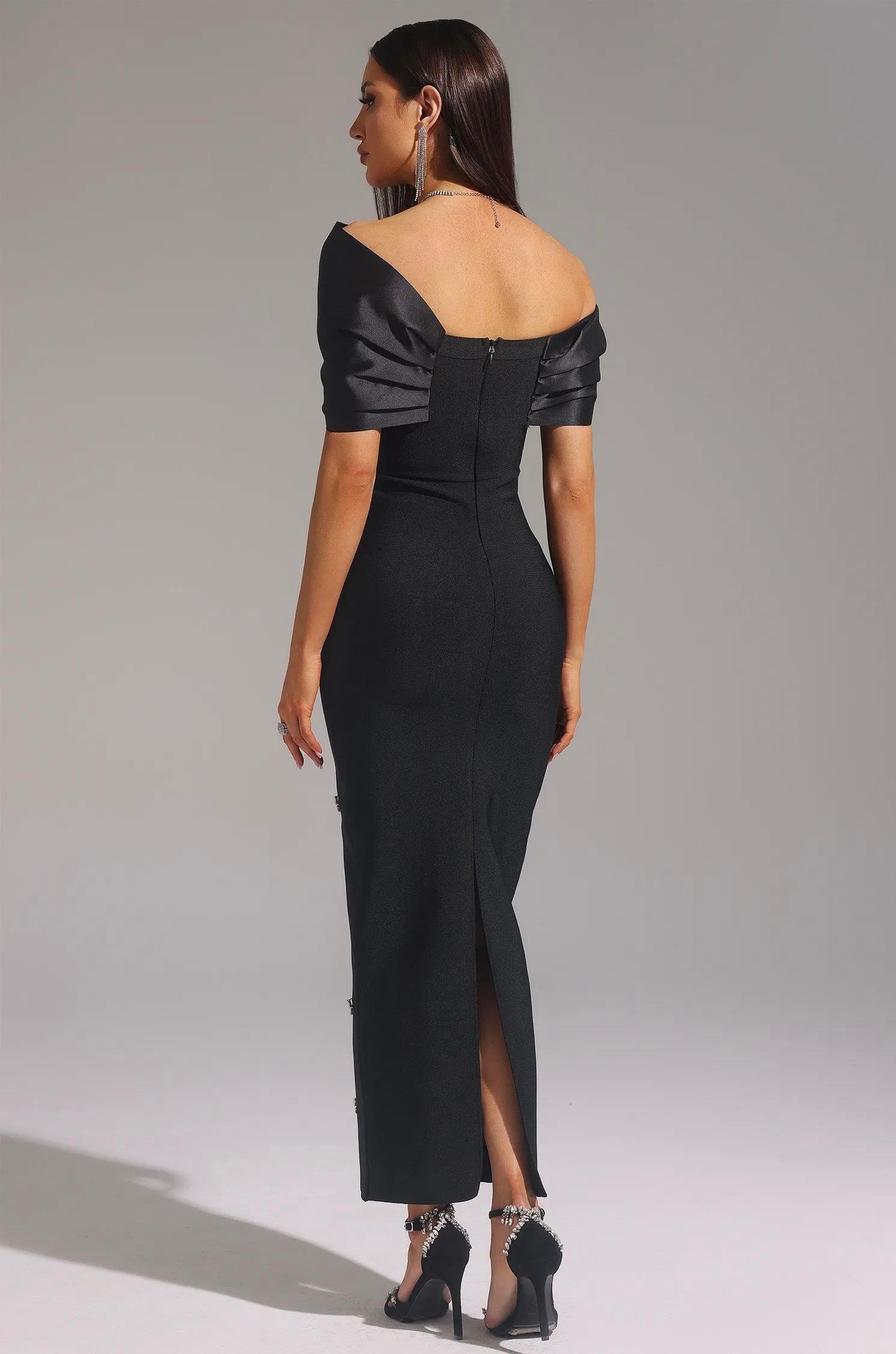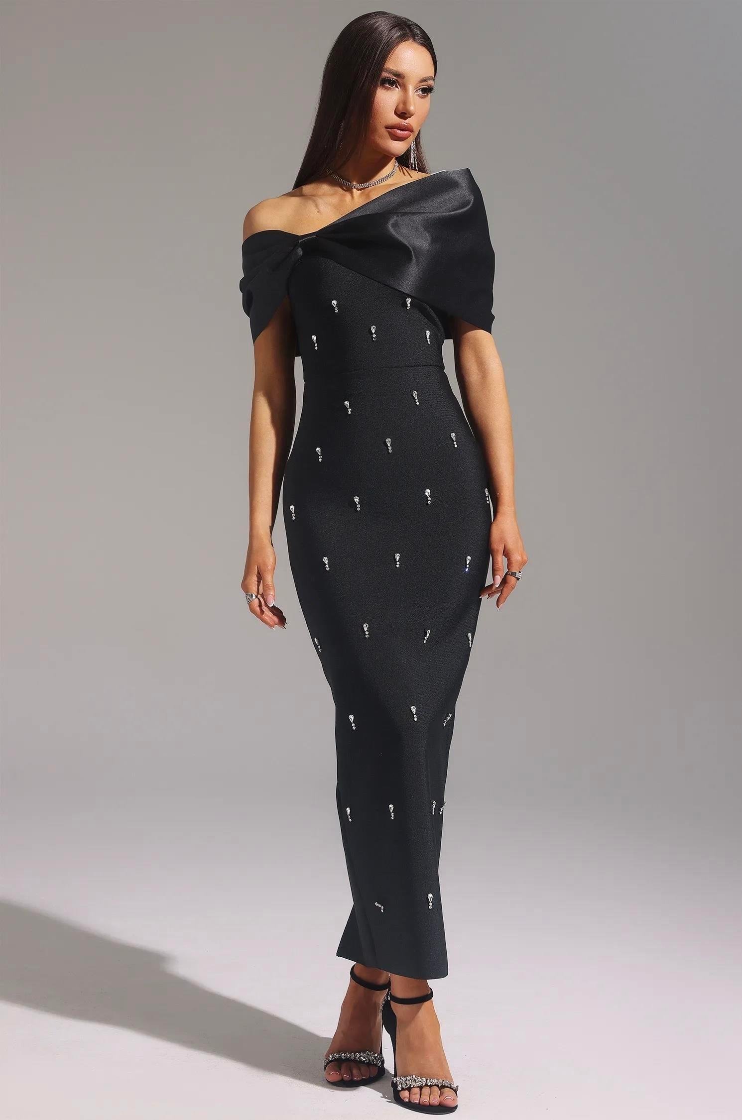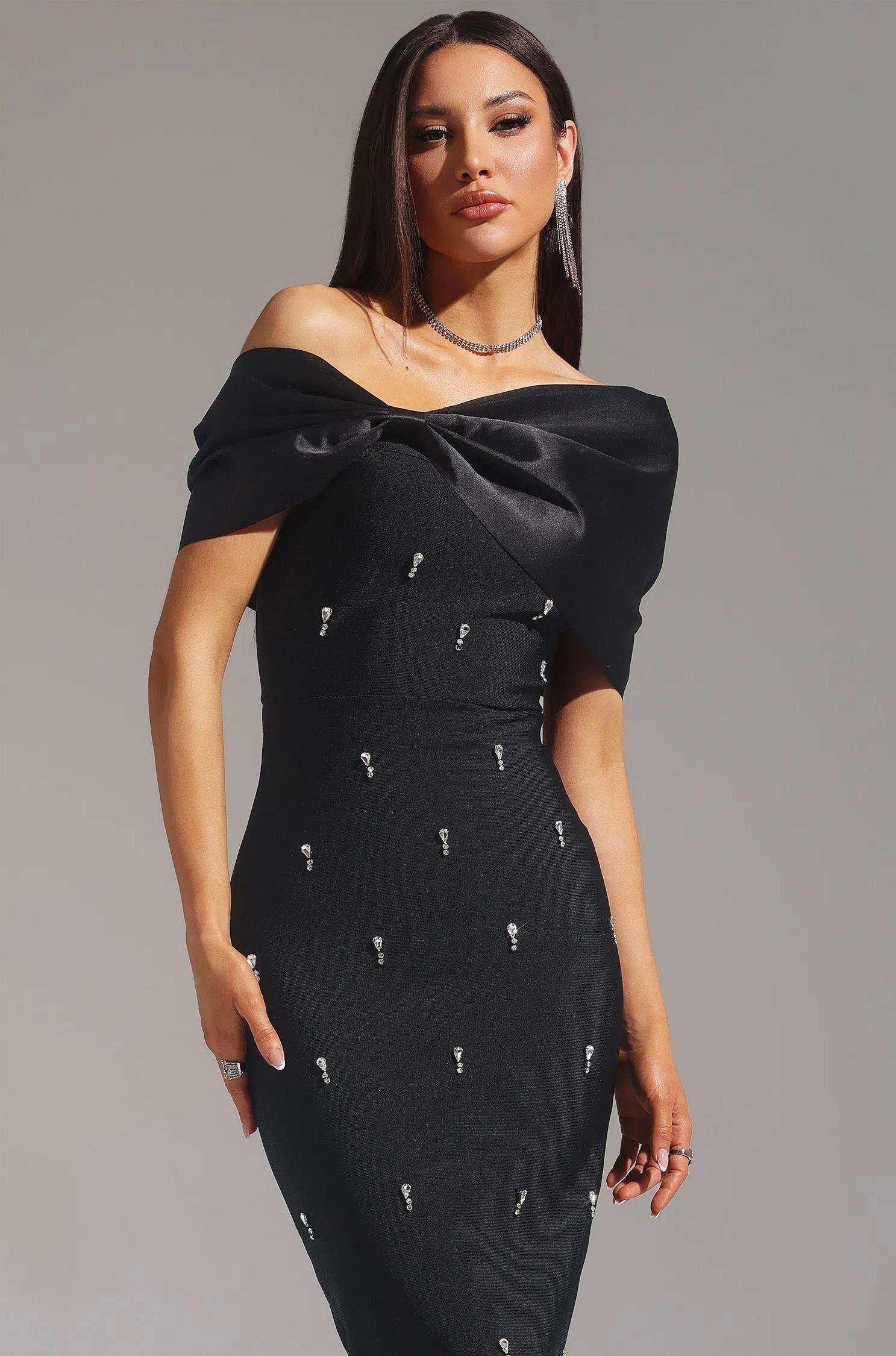 Omzu Kurdele Detaylı Kristal Taşlı Midi Tasarım Elbise (DA0003030)