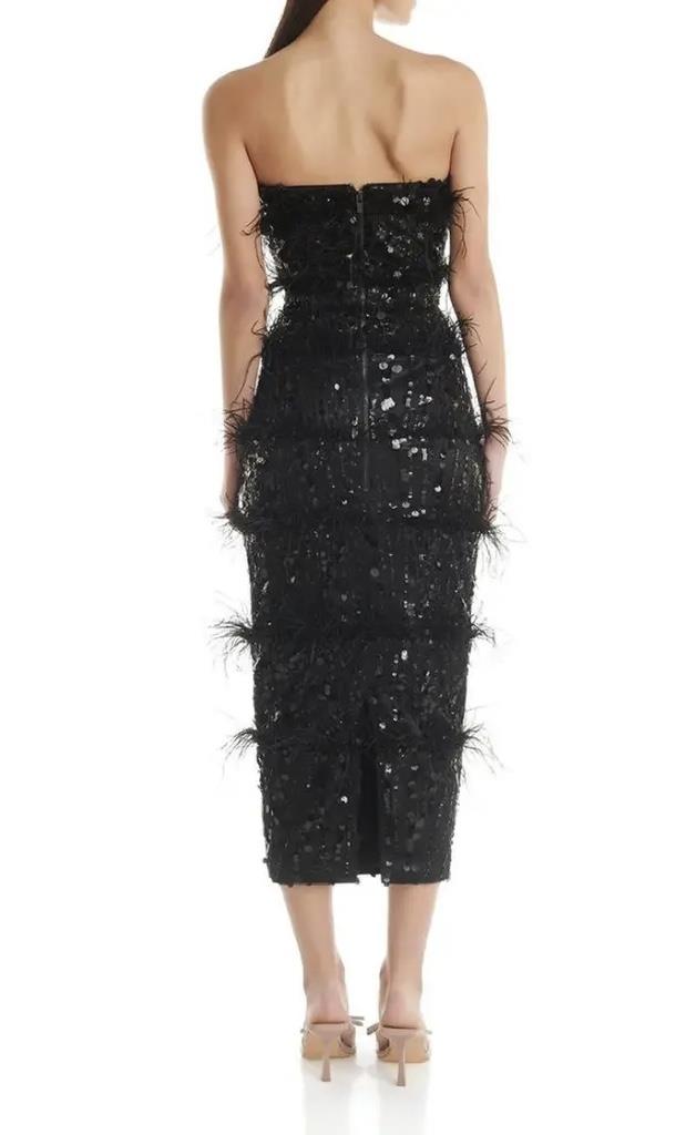 Otrişli İşlemeli Straplez Siyah Midi Tasarım Elbise (DA0003111)
