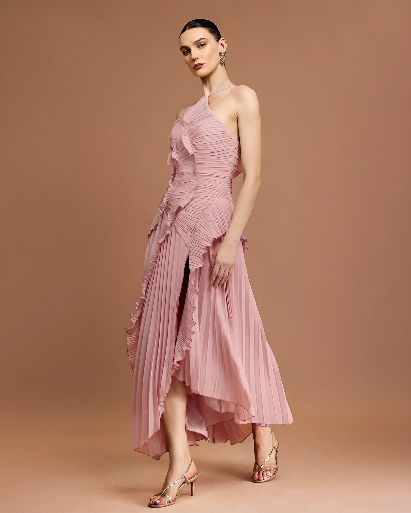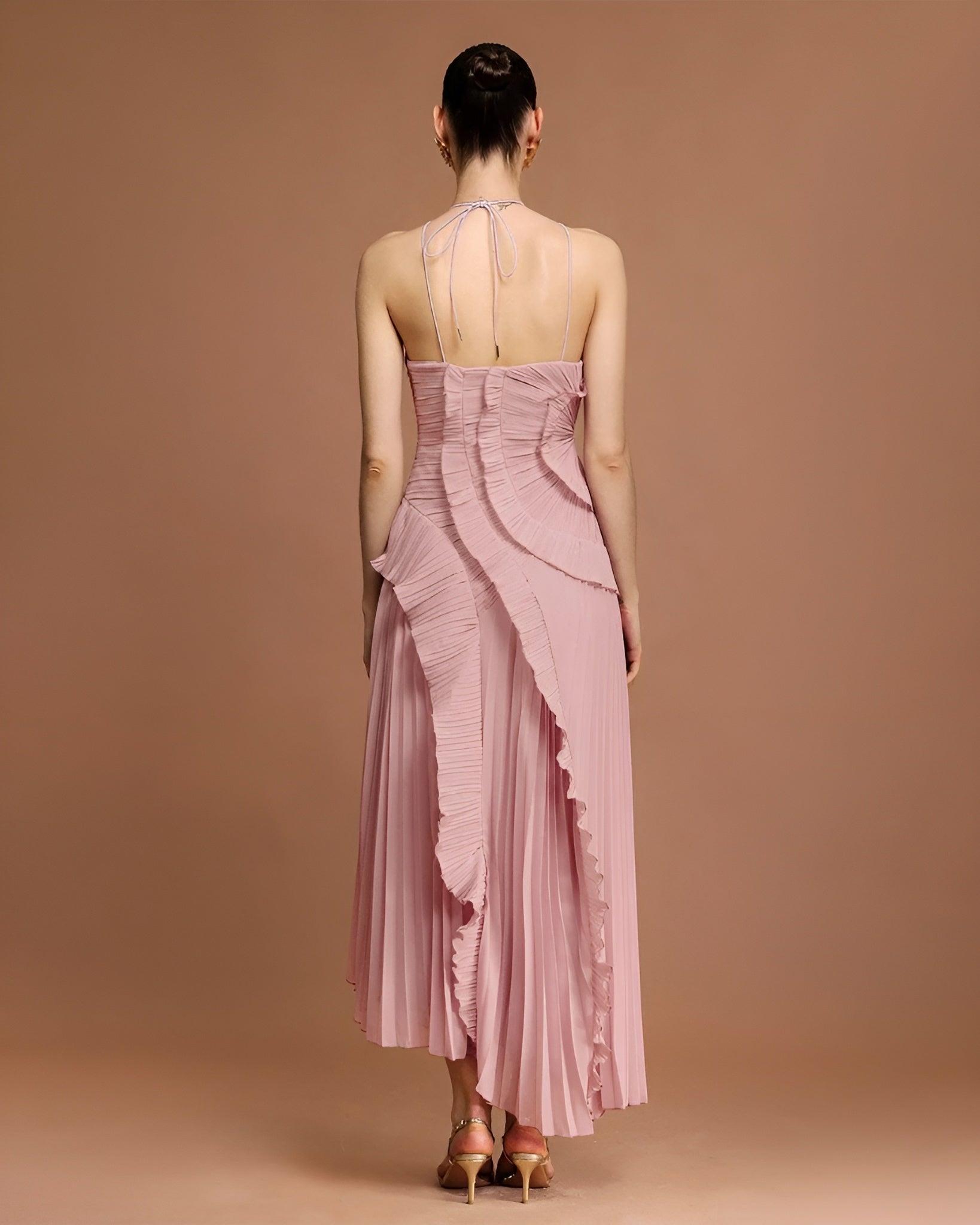 Özel Pliseli Boyundan Bağlı Pembe Tasarım Midi Elbise (DA0003018)