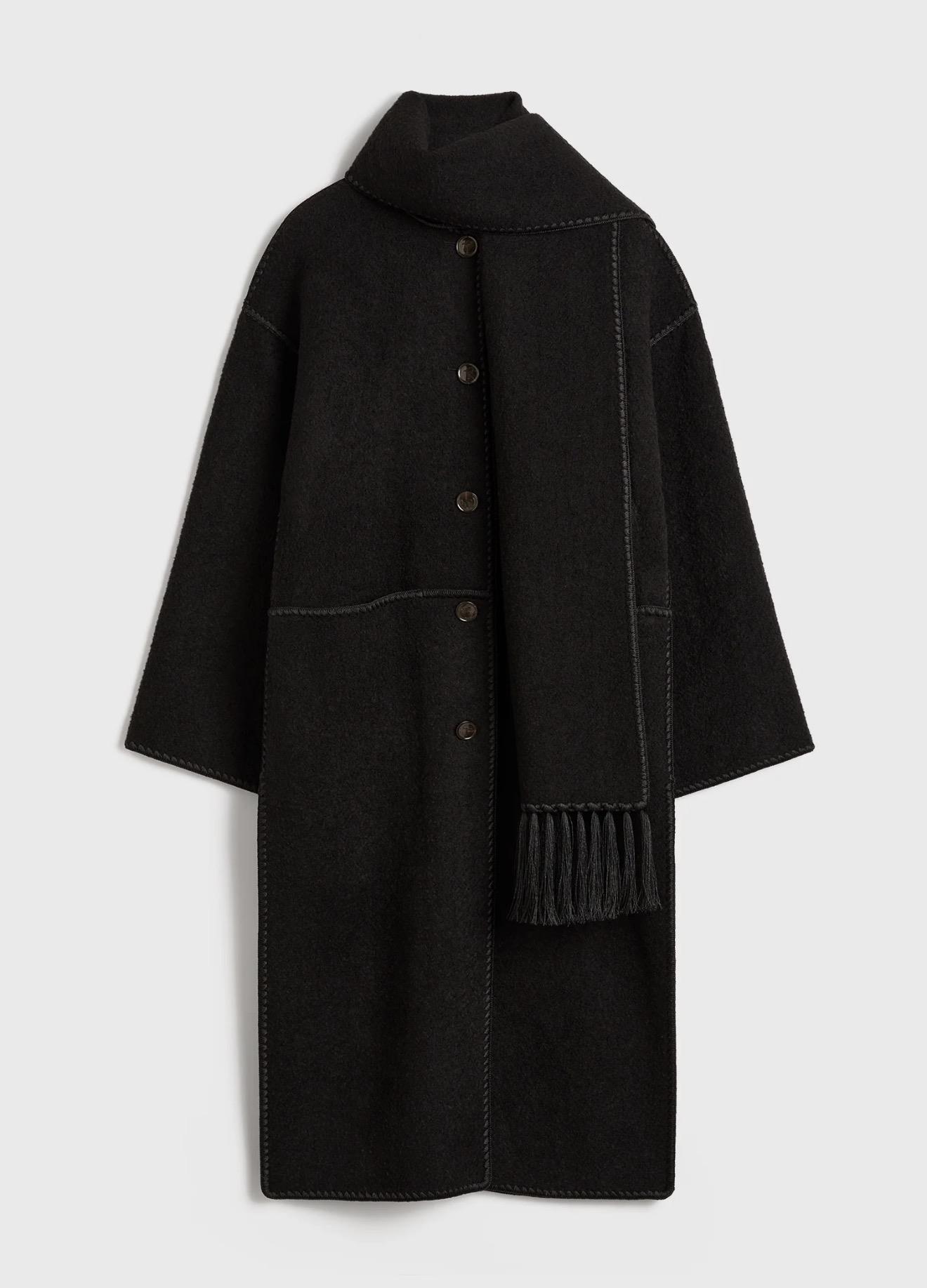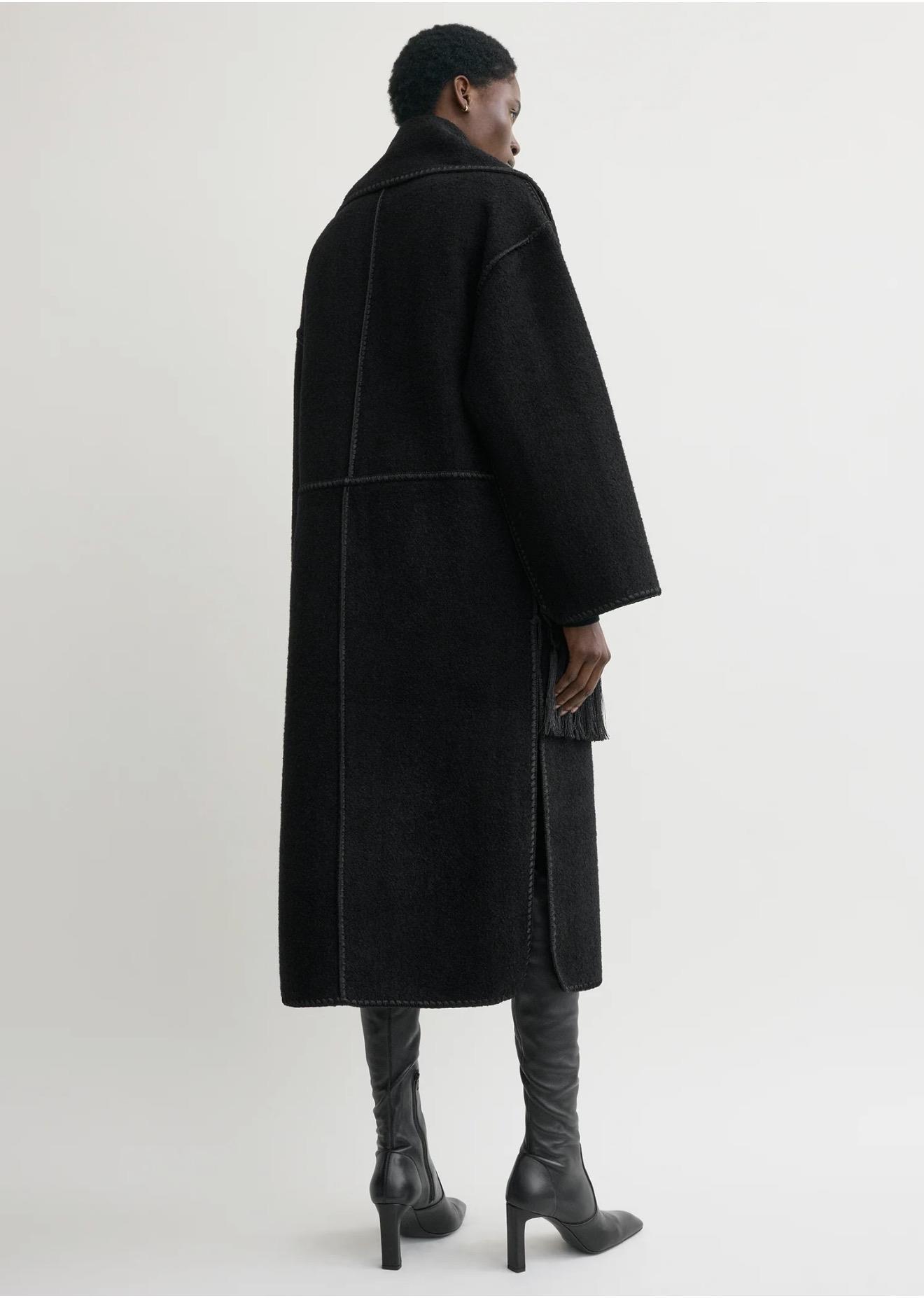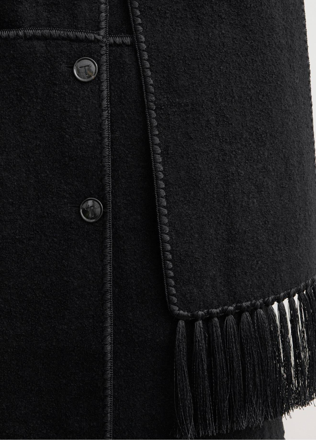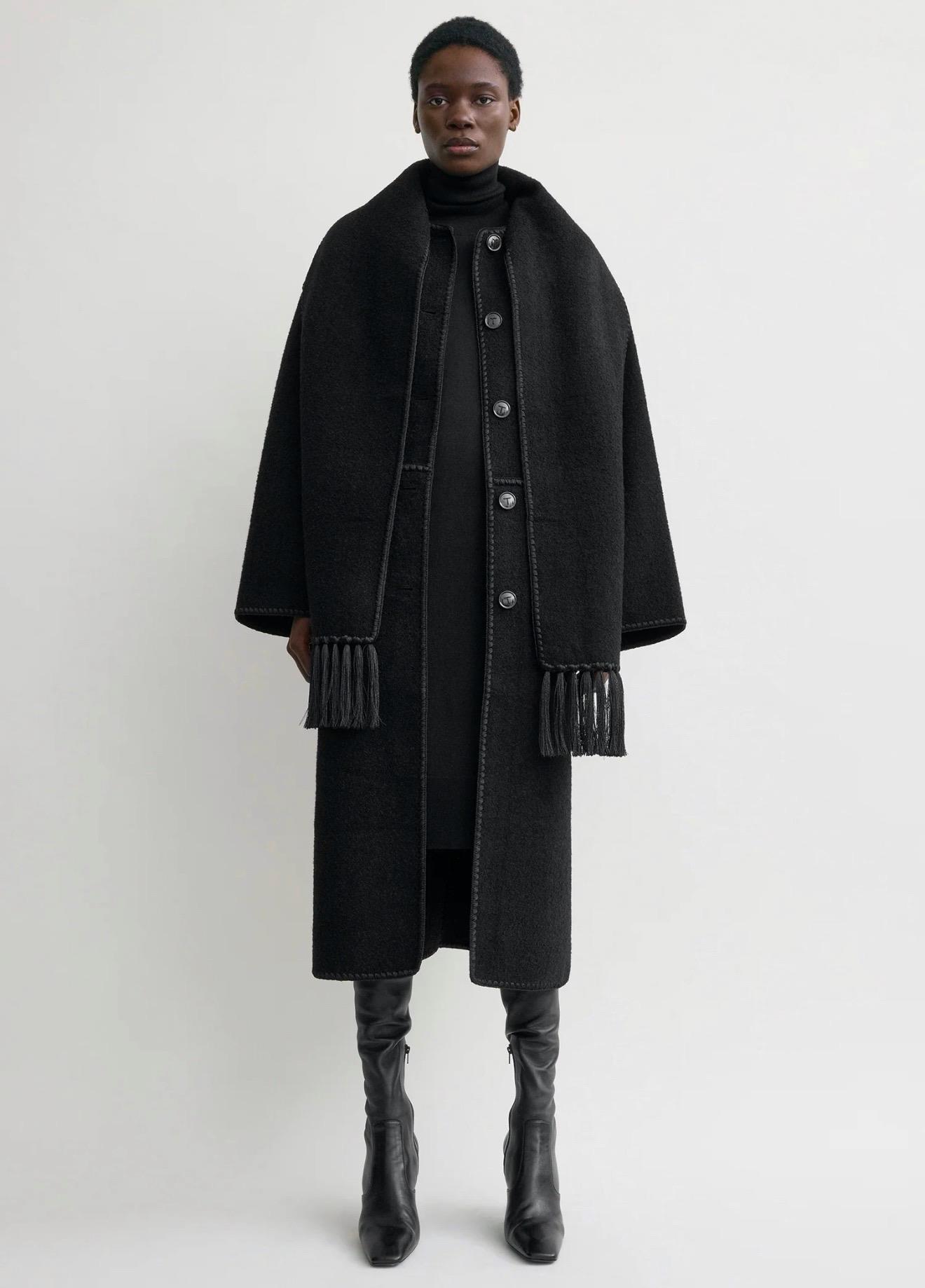 Püsküllü Kaşkollu Yün Premium Siyah Midi Kaban (DA0003105)