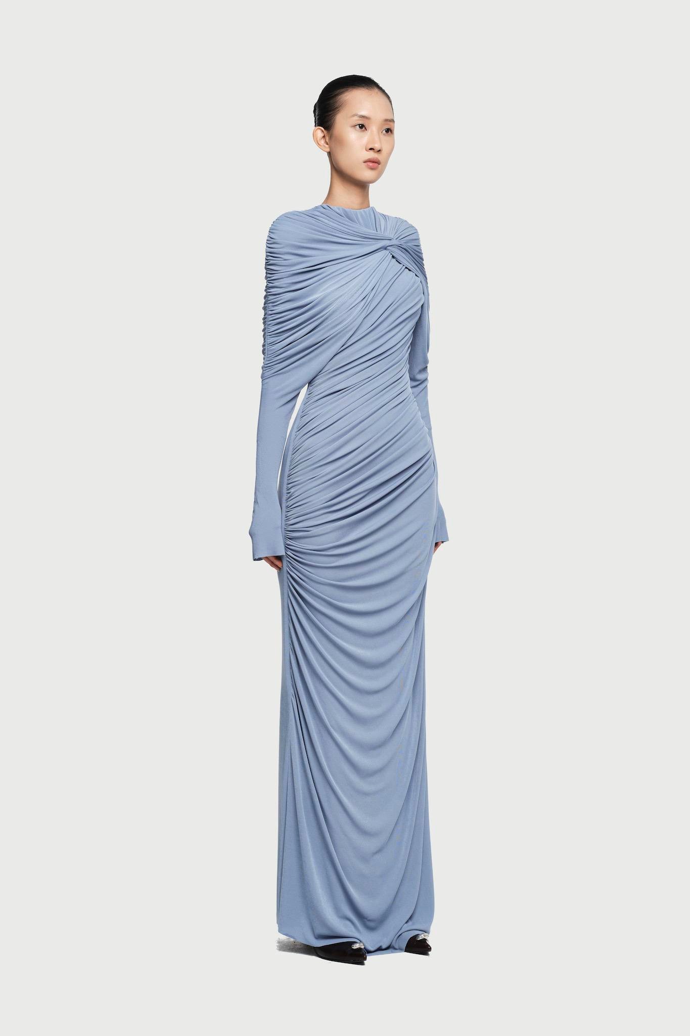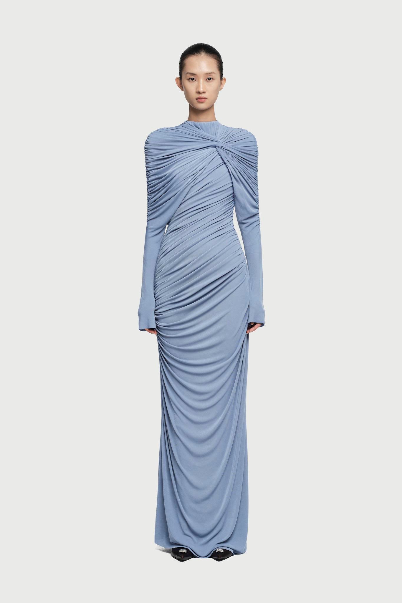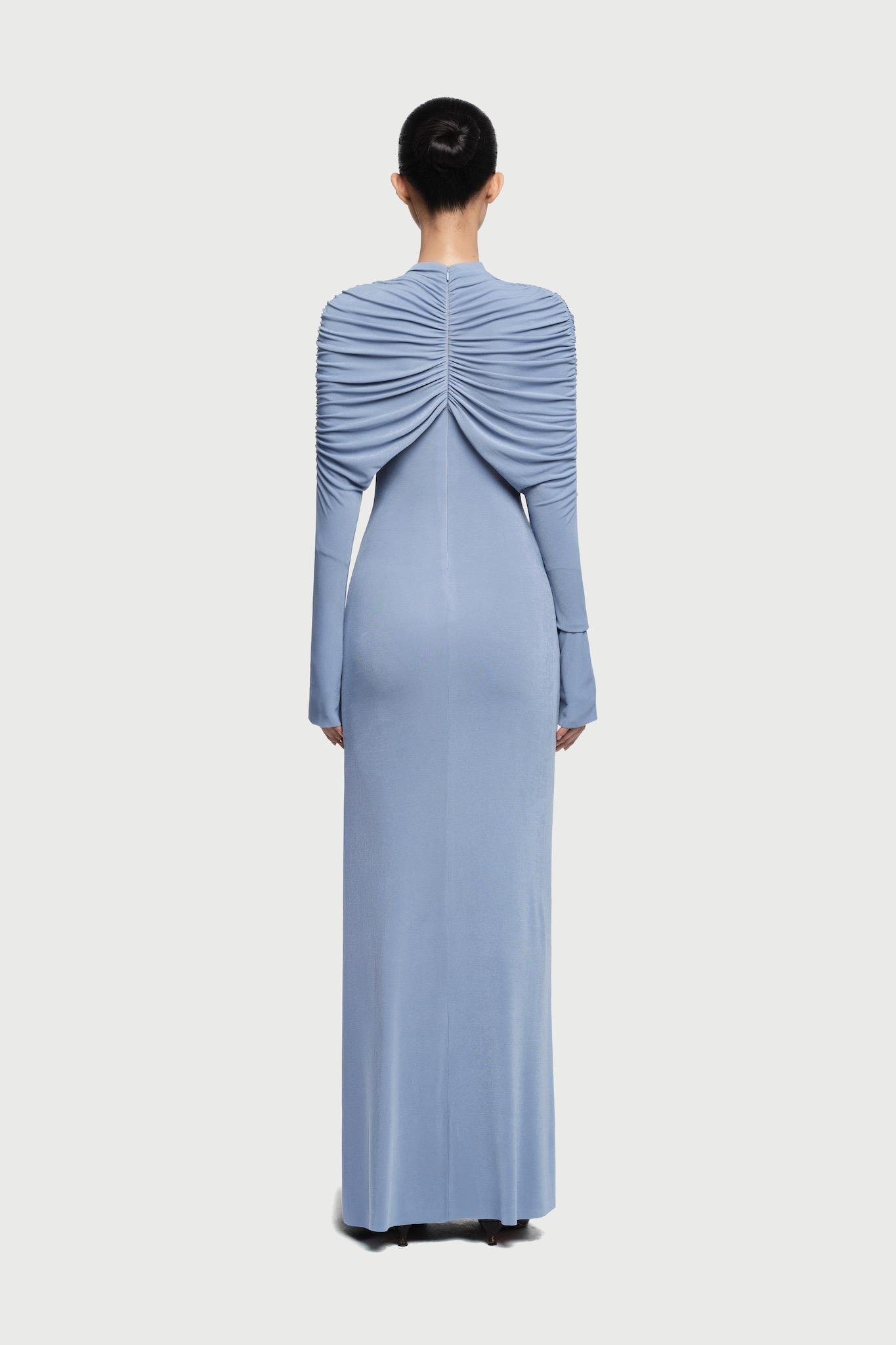 Tamamı Drapeli Uzun Kollu Mavi Maksi Tasarım Elbise (DA0003058)
