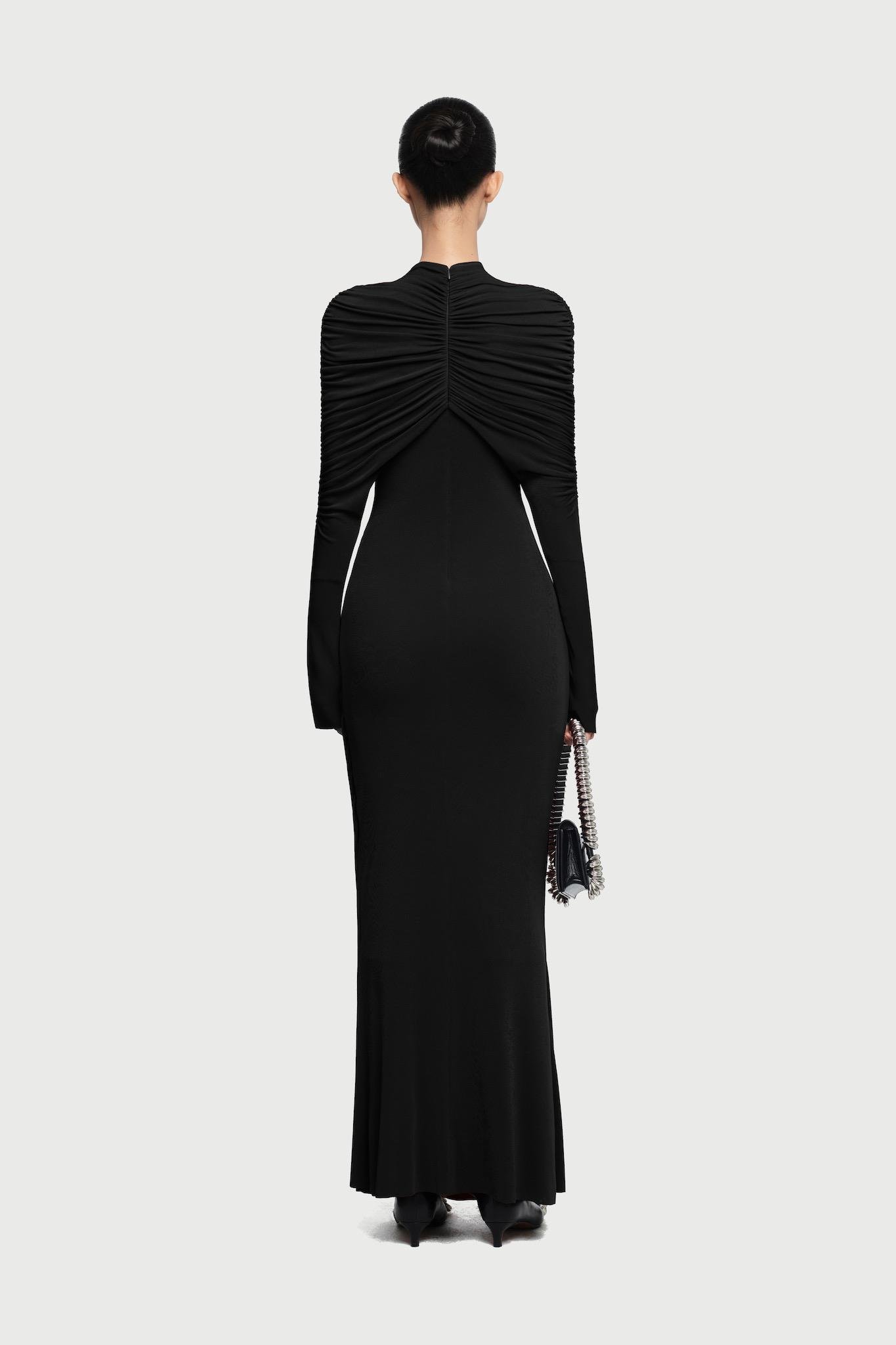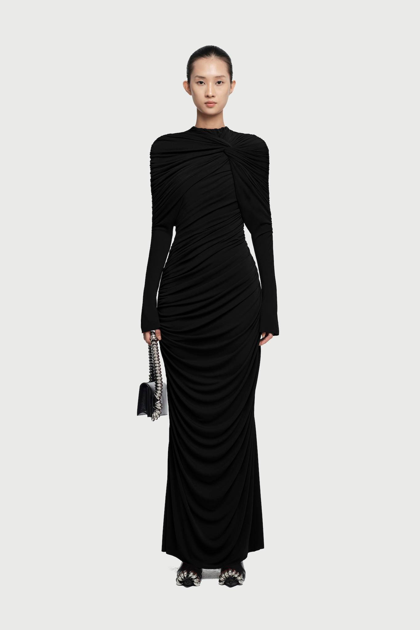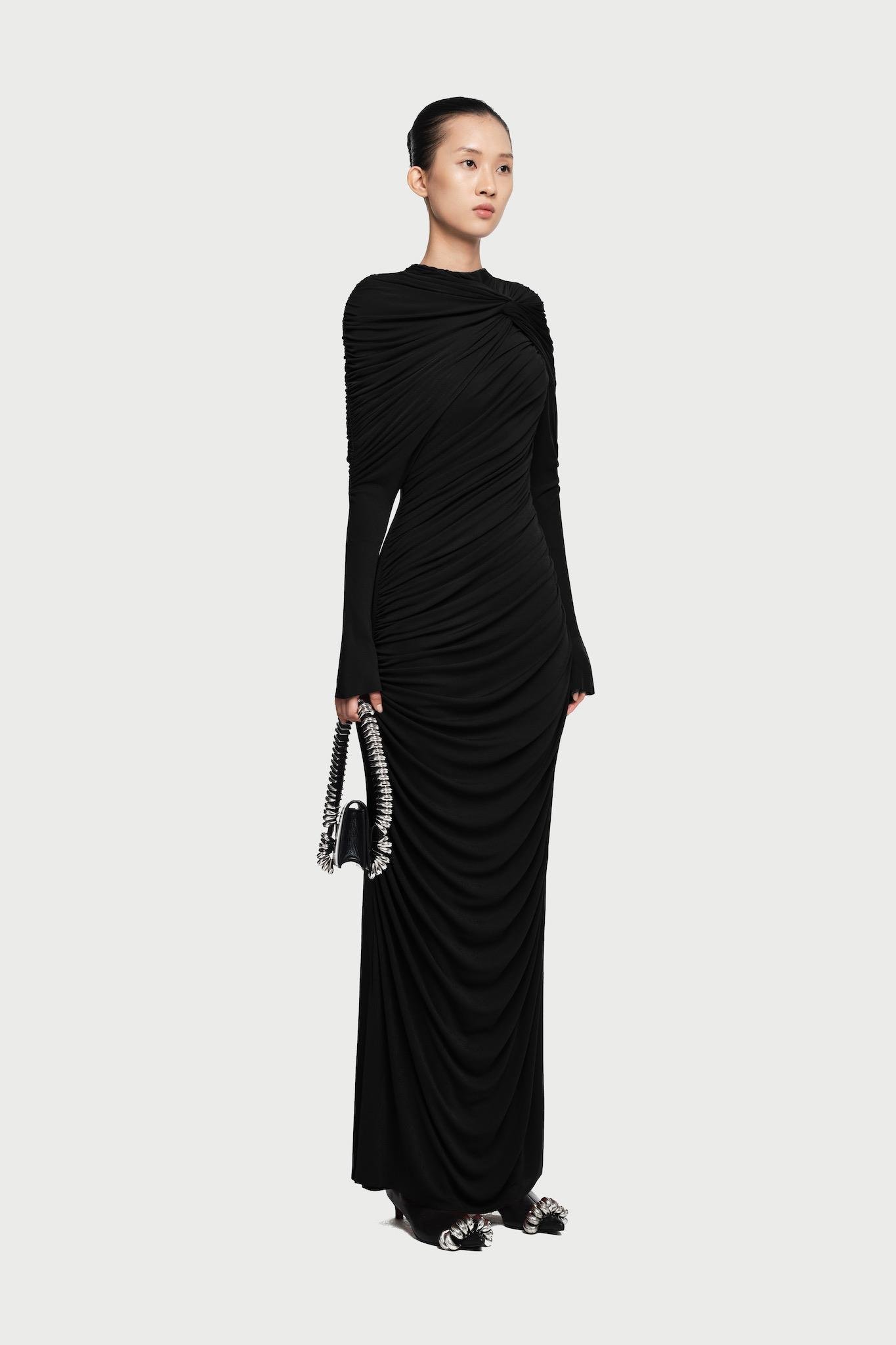 Tamamı Drapeli Uzun Kollu Siyah Maksi Tasarım Elbise (DA0003060)