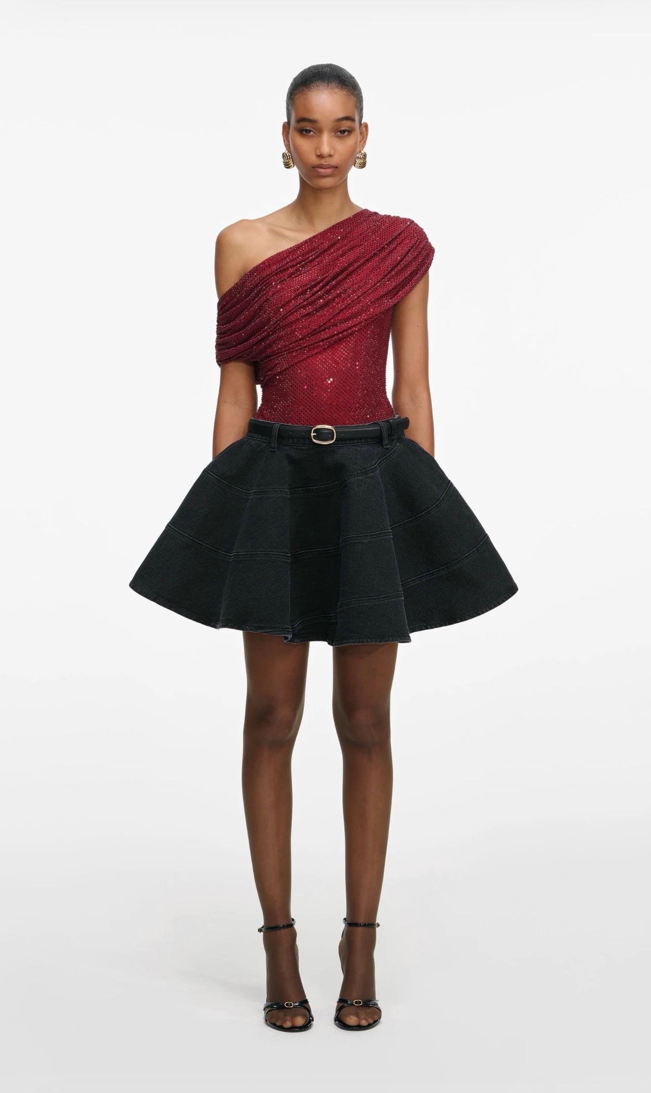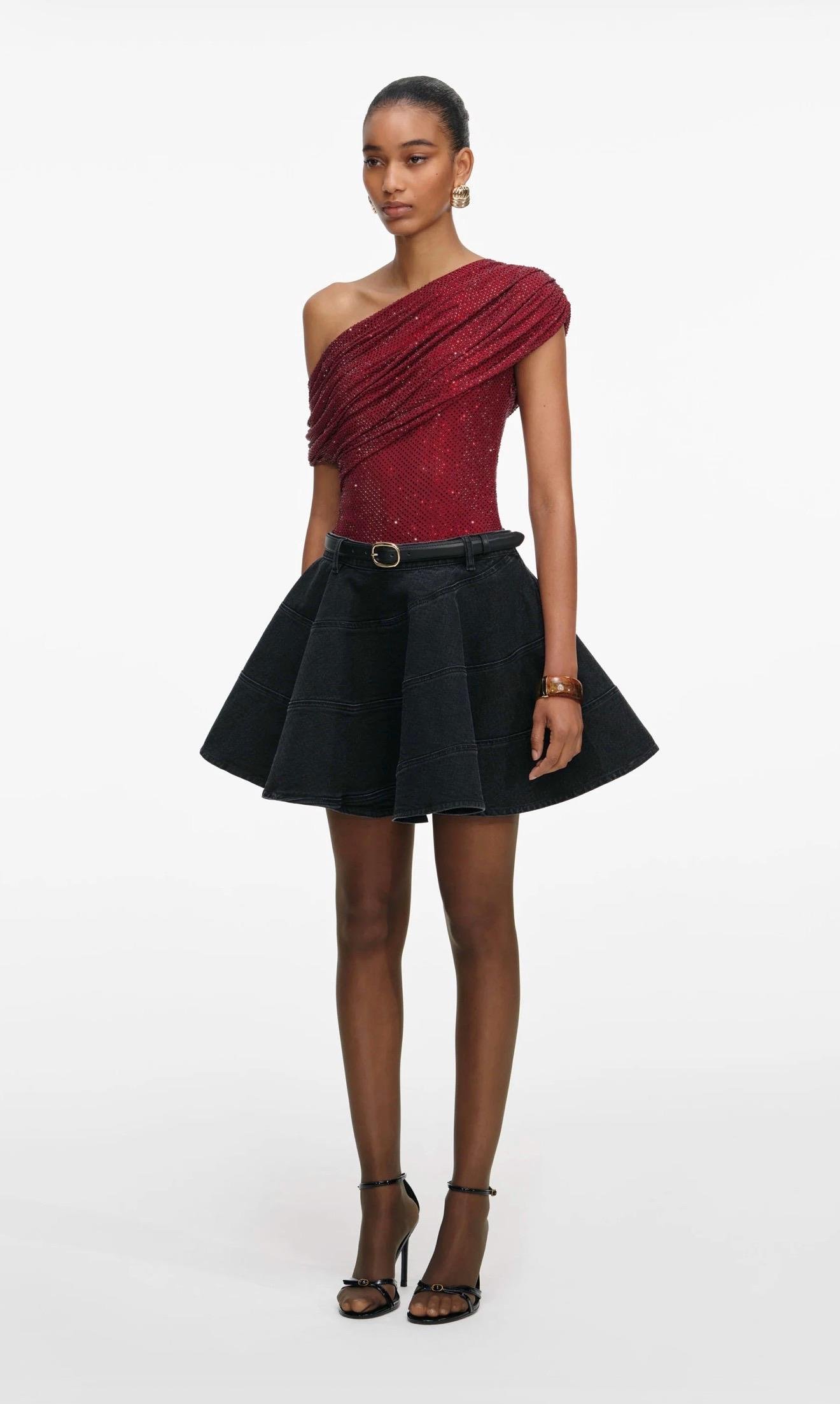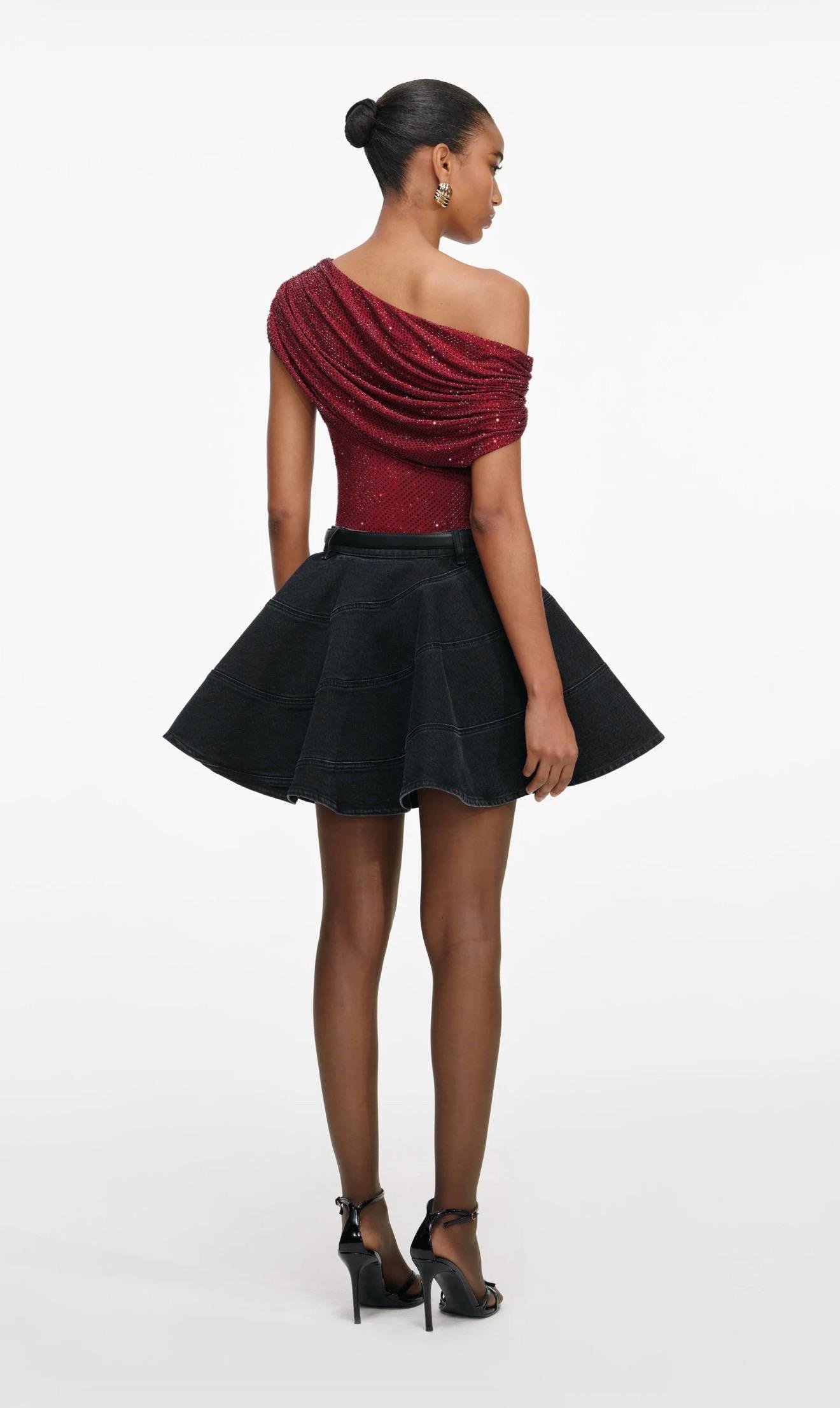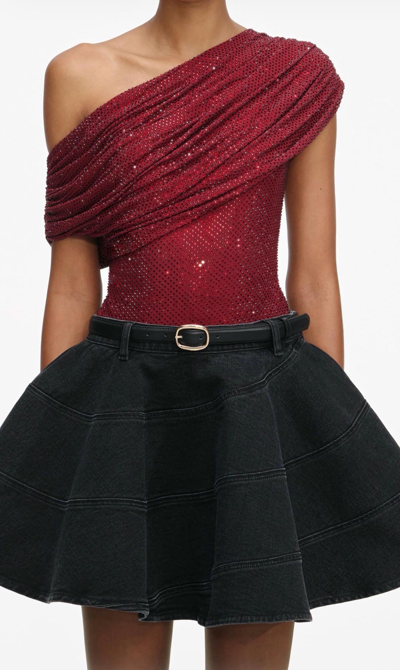 Tek Omzu Düşük Bordo Kristal Taşlı Premium Bluz (DA0003100)