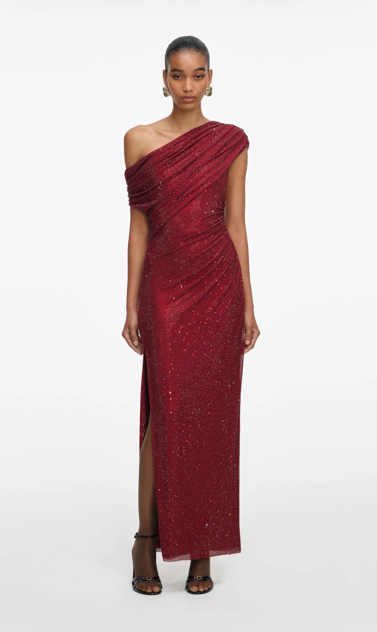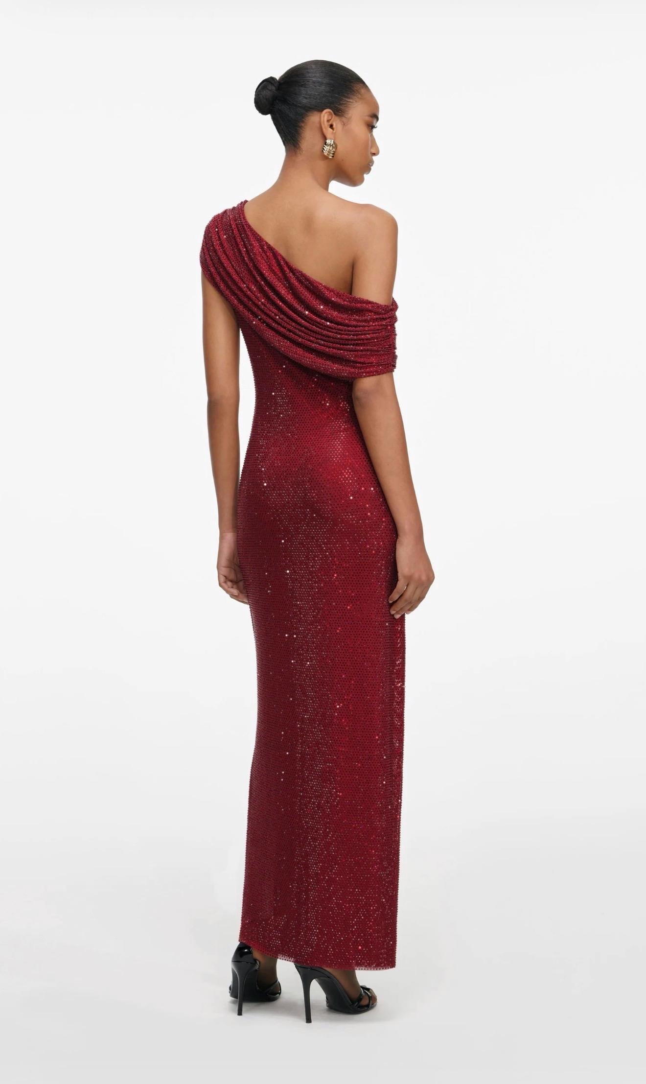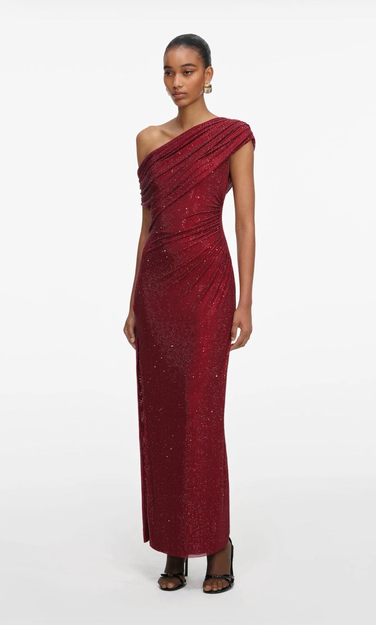 Tek Omzu Düşük Kırmızı Kristal Taşlı Yırtmaçlı Premium Maksi Elbise (DA0003099)