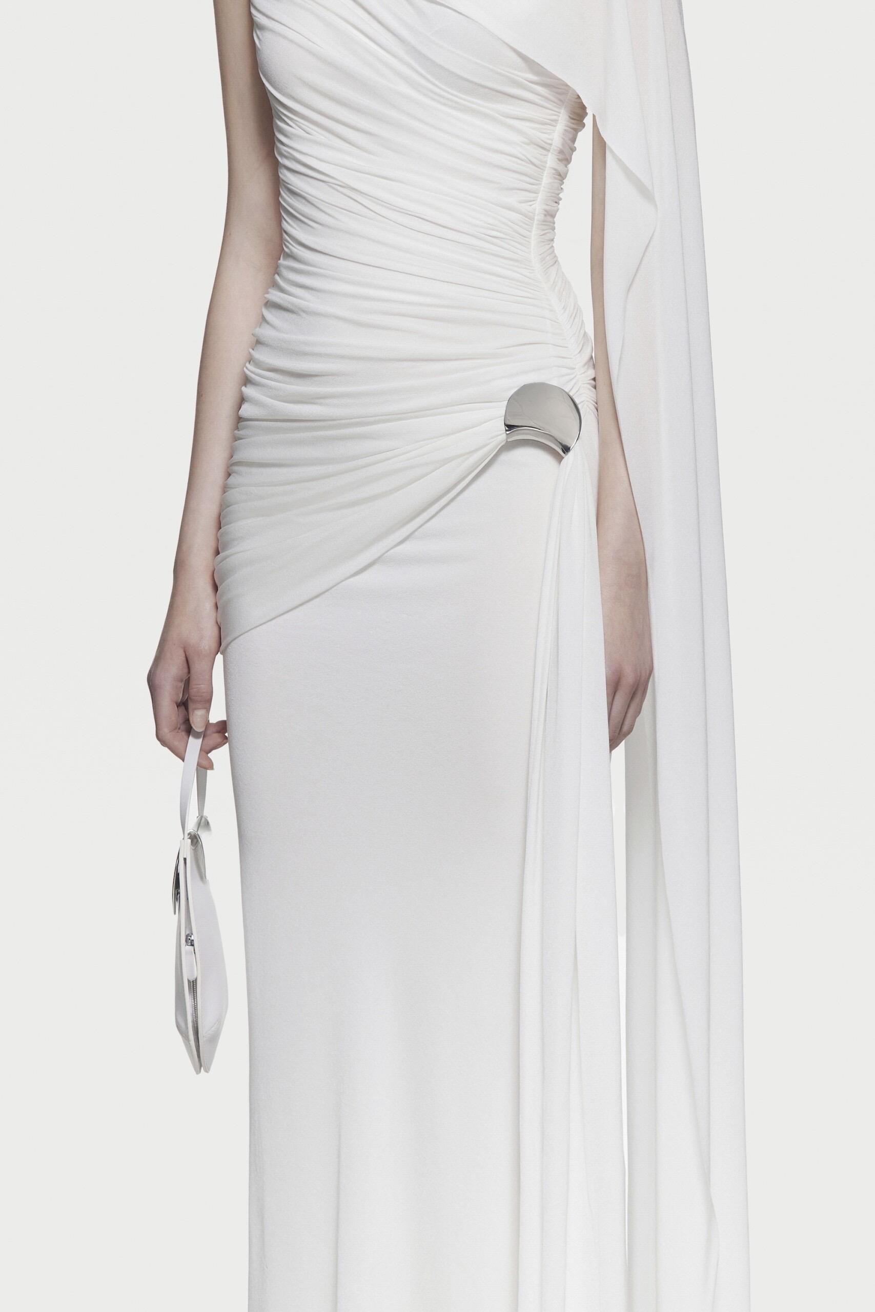 Tokalı Pelerin Detaylı Tek Kollu Drape Beyaz Tasarım Maksi Elbise (DA0003057)