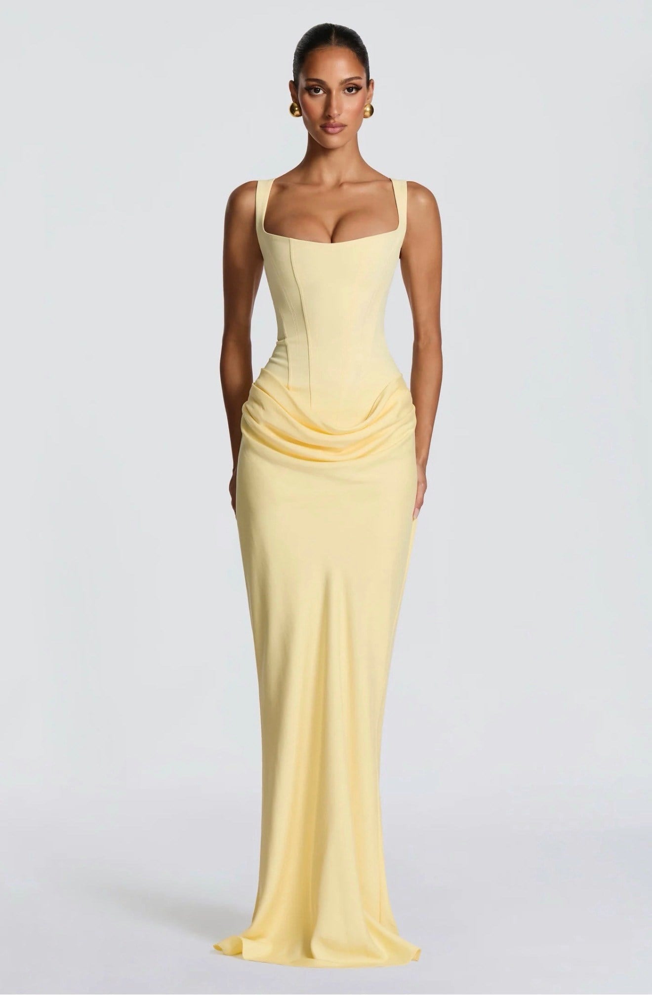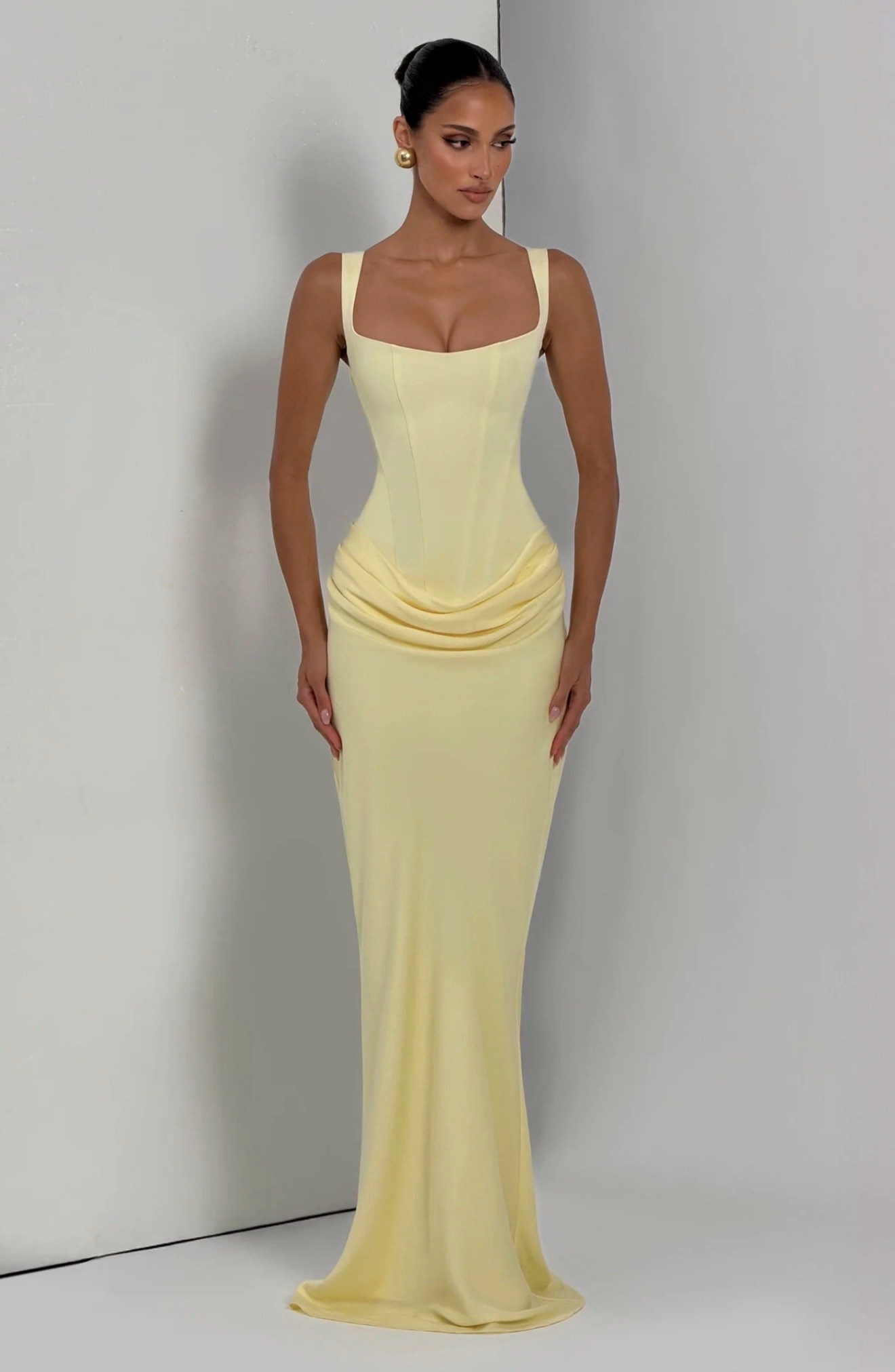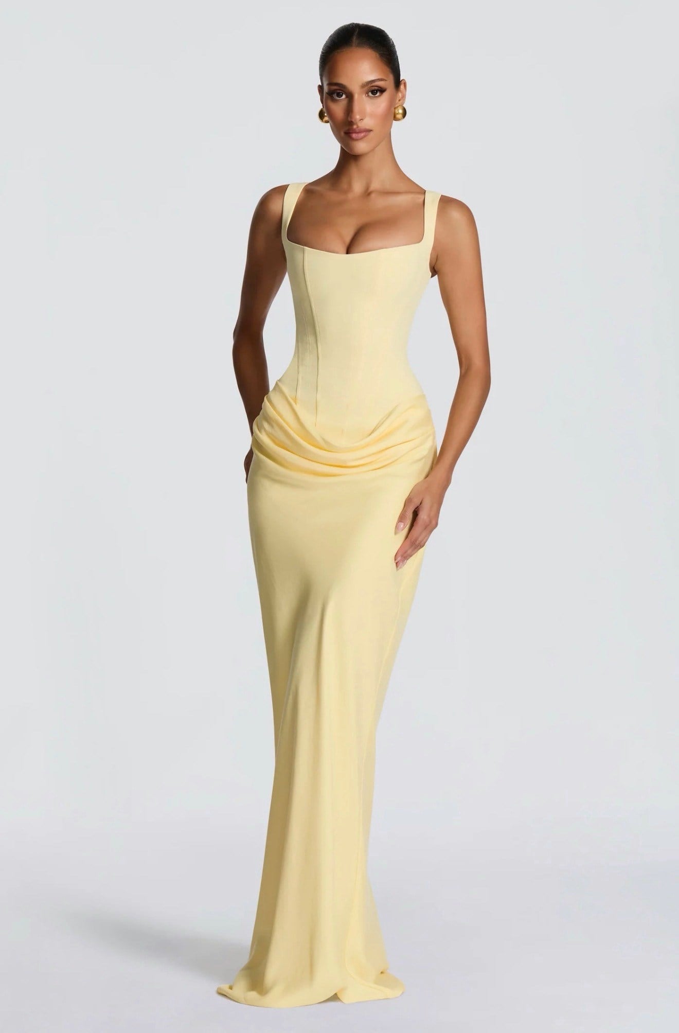 Üstü Korse Eteği Drape Detaylı Sarı Maksi Elbise (DA0003510)