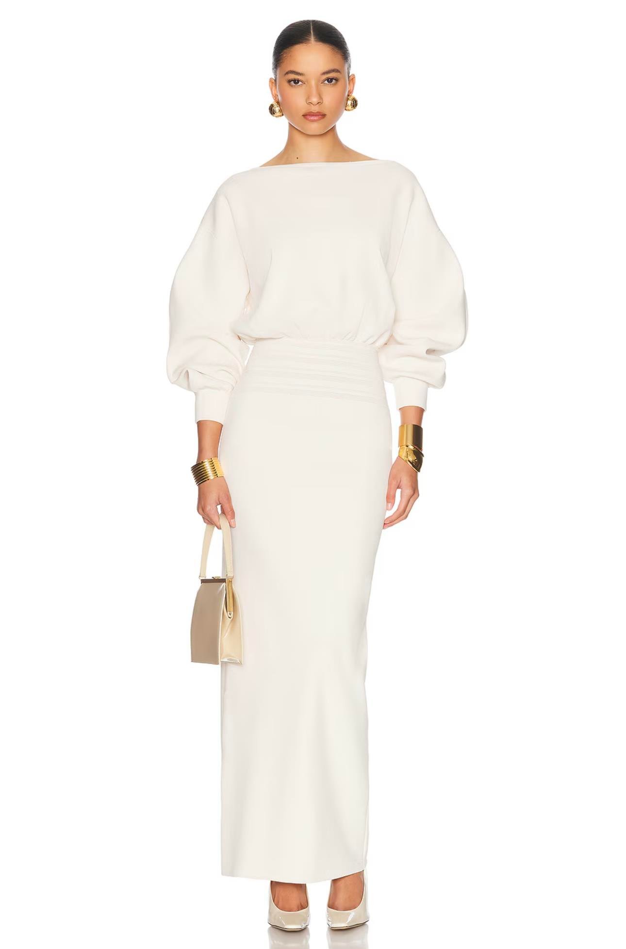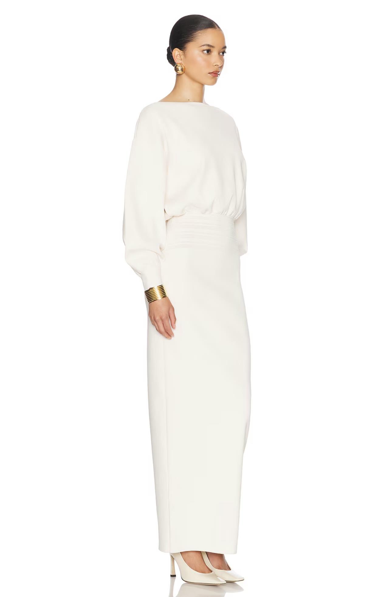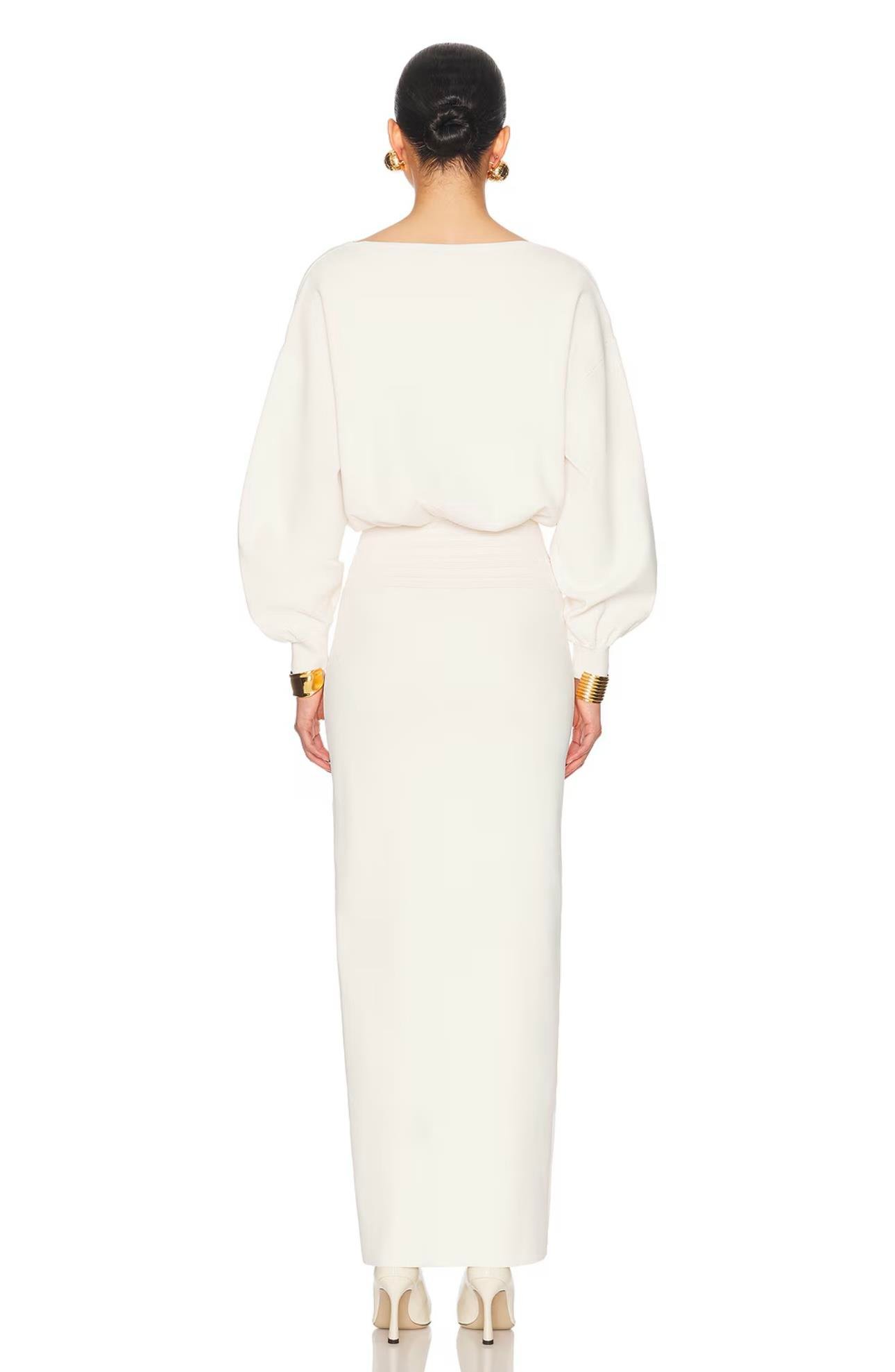 Uzun Kollu Midi Boy Krem Rengi Tasarım Elbise (DA0002959)