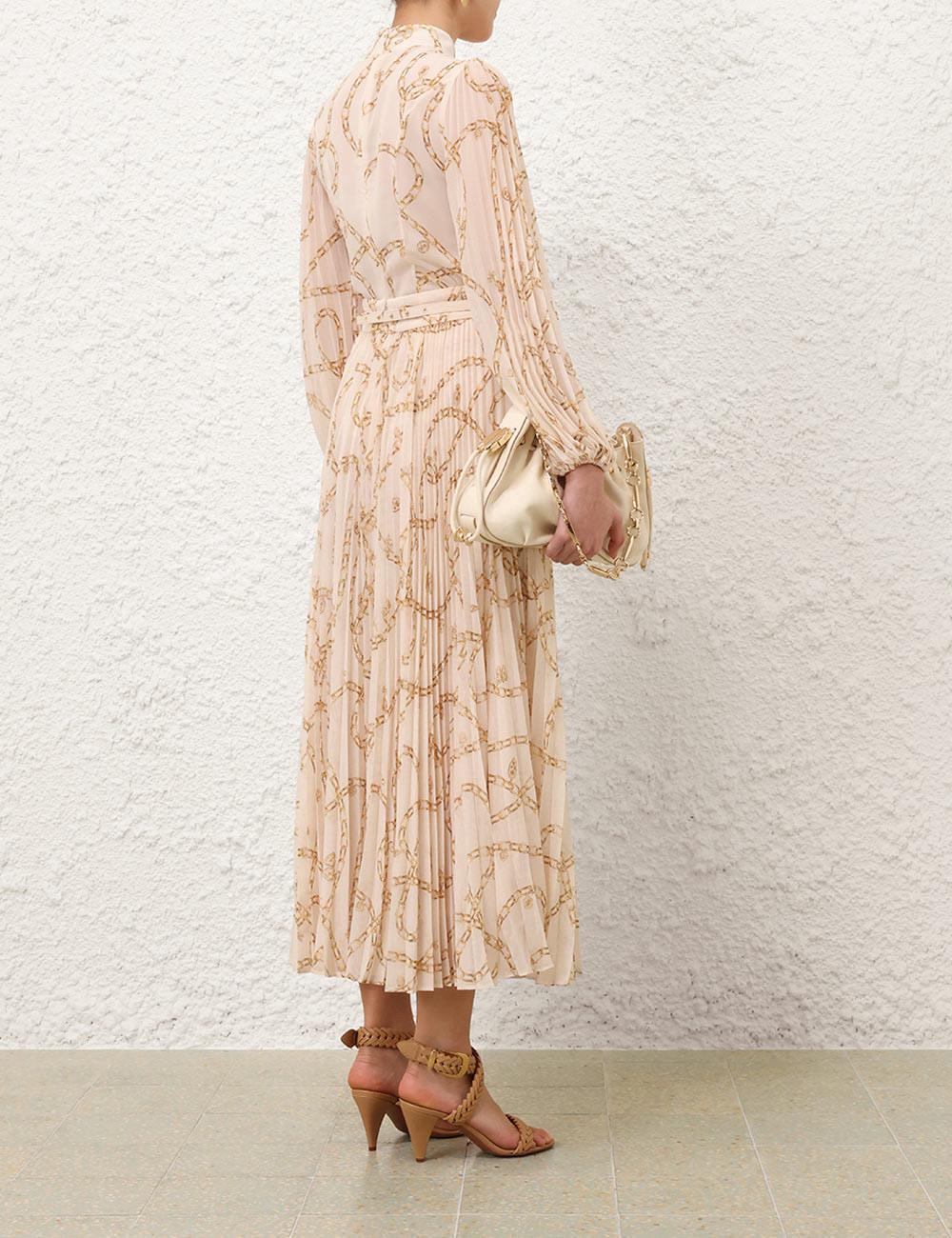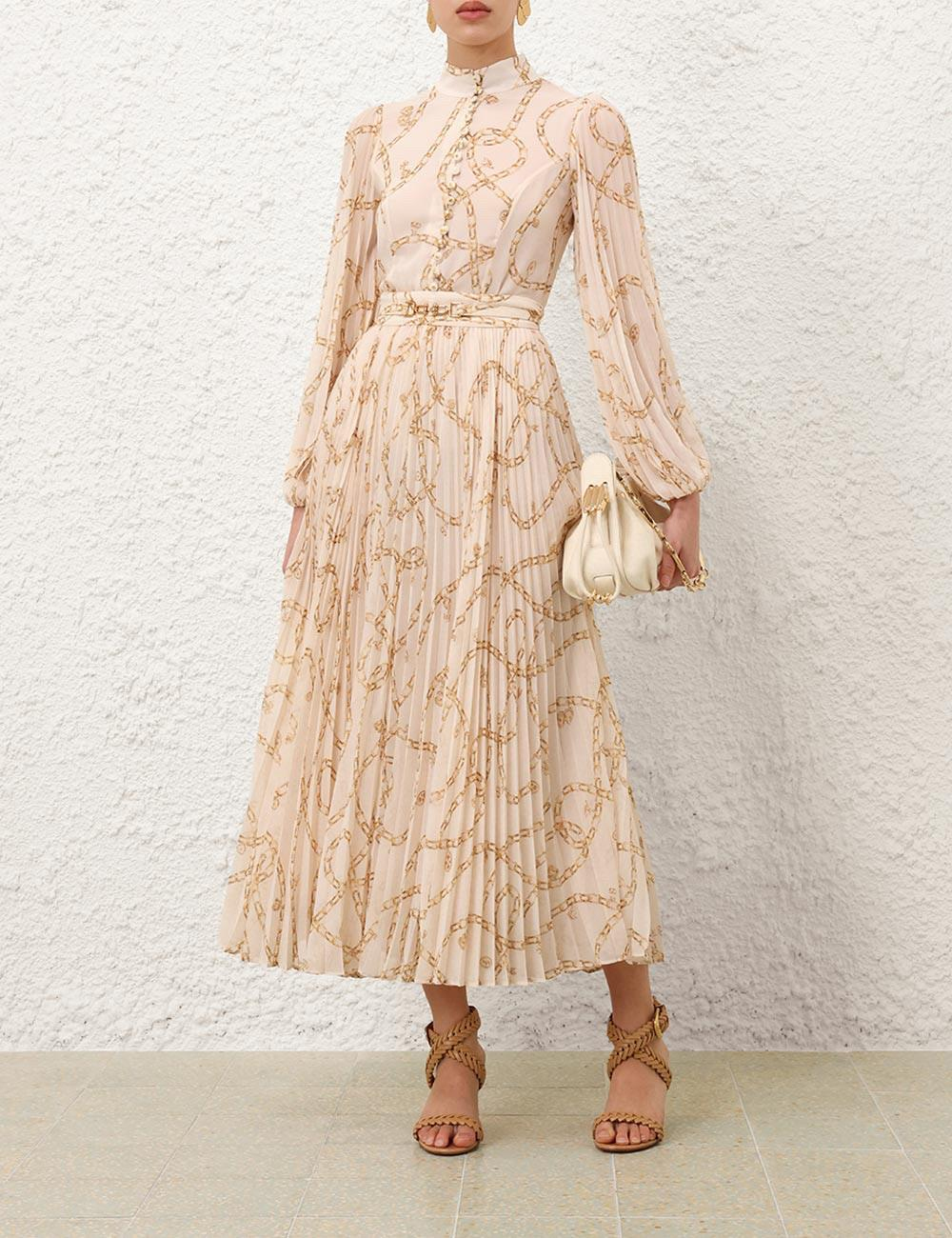 Uzun Kollu Zincir Desenli Pileli Premium Midi Krem Elbise (DA0002946)