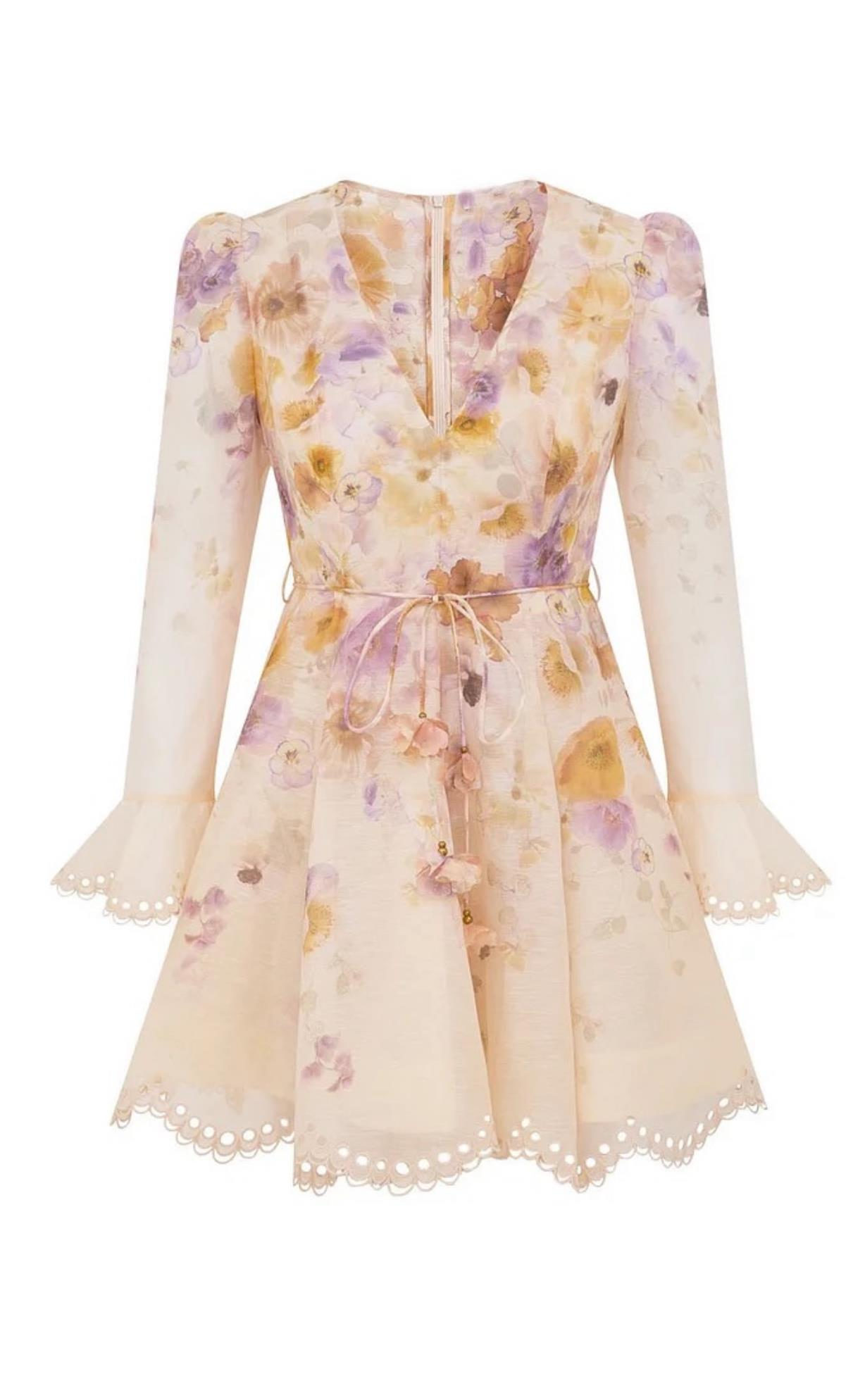 V Yaka Çiçek Desenli Premium Mini Elbise (DA0002958)