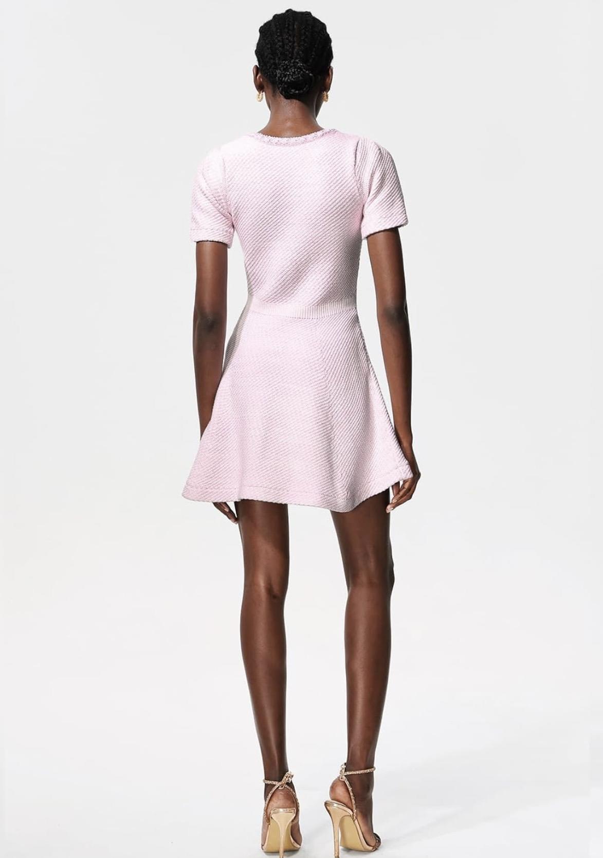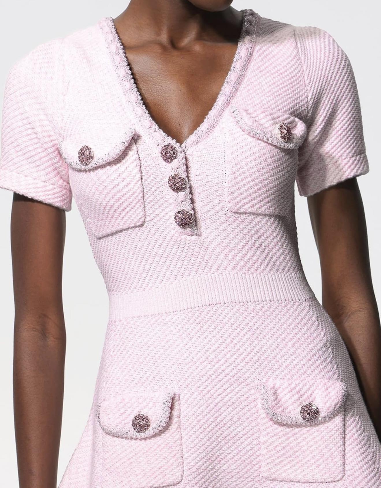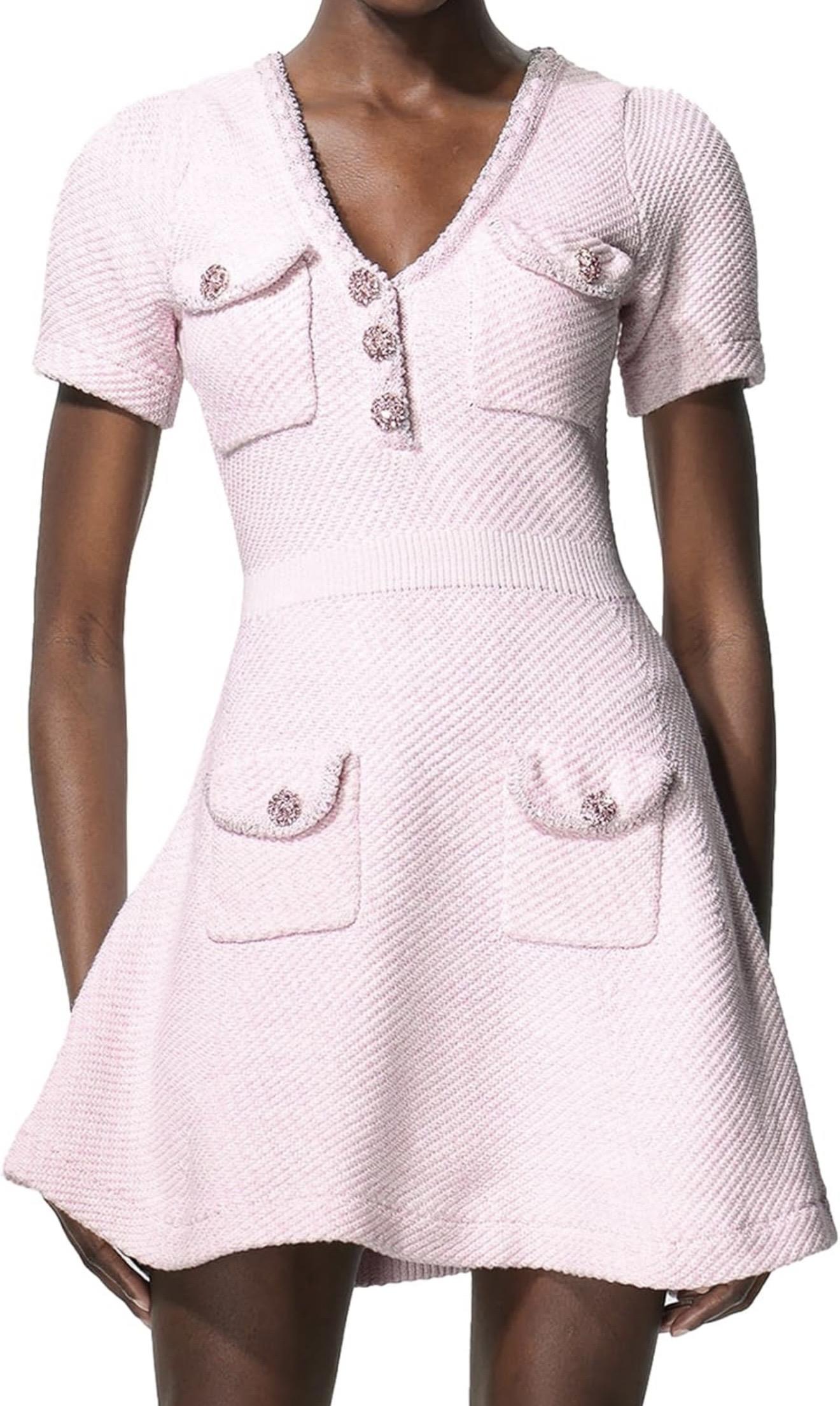 V Yaka Düğme Detaylı Cepli Toz Pembe Mini Tasarım Elbise (DA0003045)
