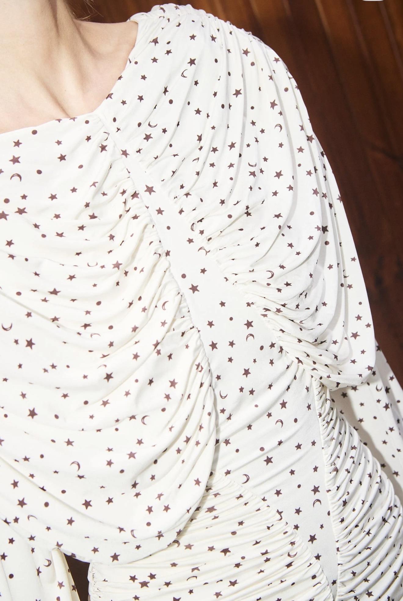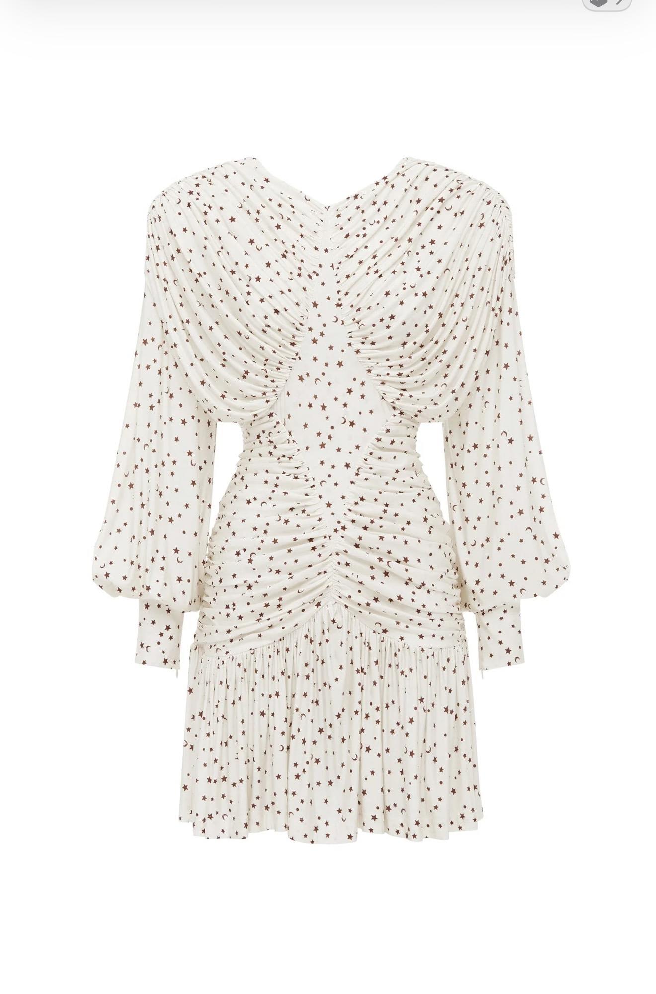 Yıldız Desenli Drapeli Dökümlü Premium Mini Beyaz Elbise (DA0003086)