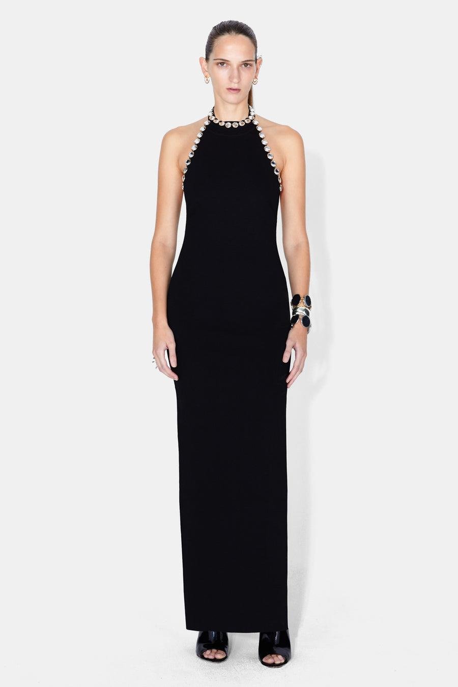 Halter Yaka Ayna Detaylı Yırtmaçlı Siyah Tasarım Elbise (DA0002014)