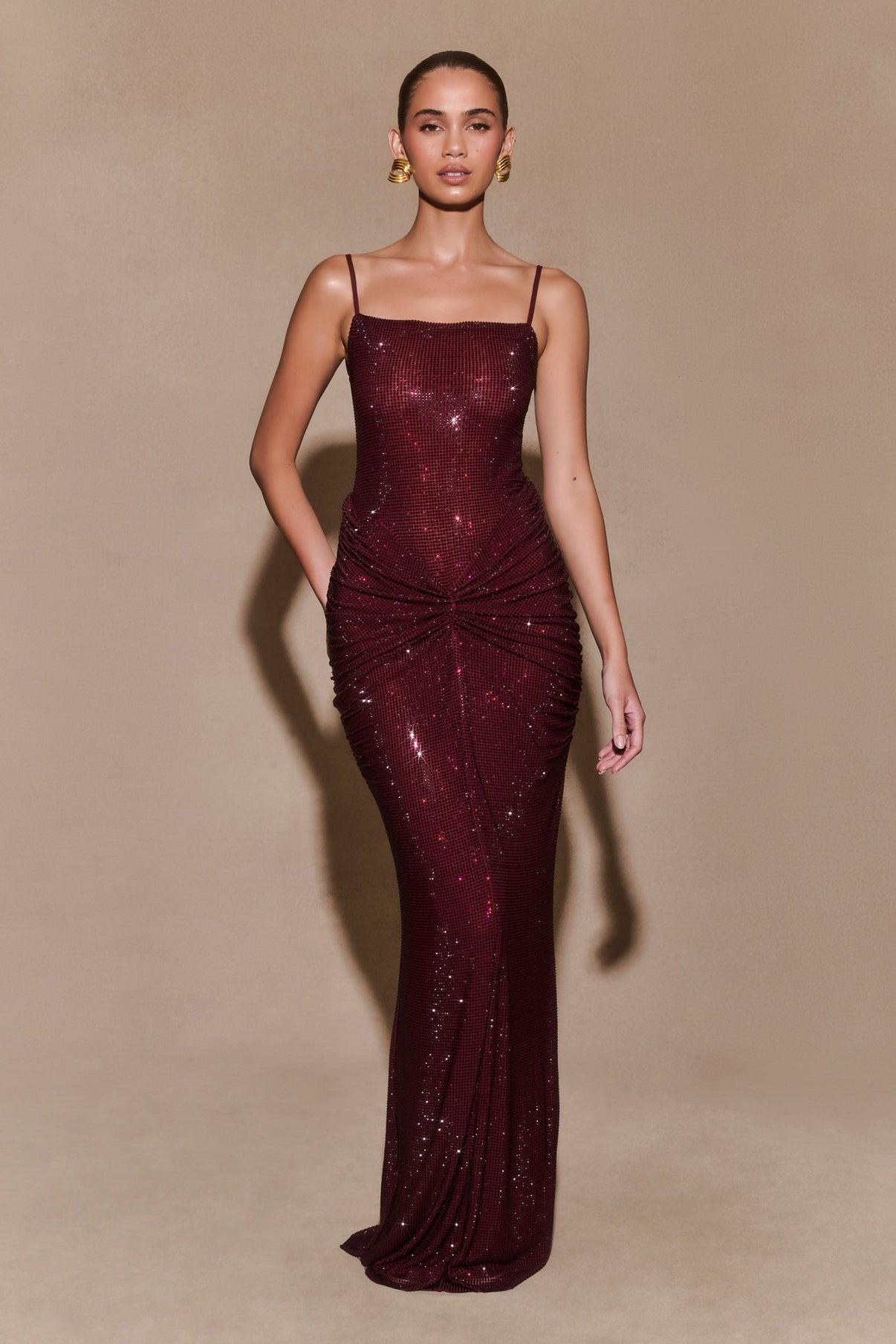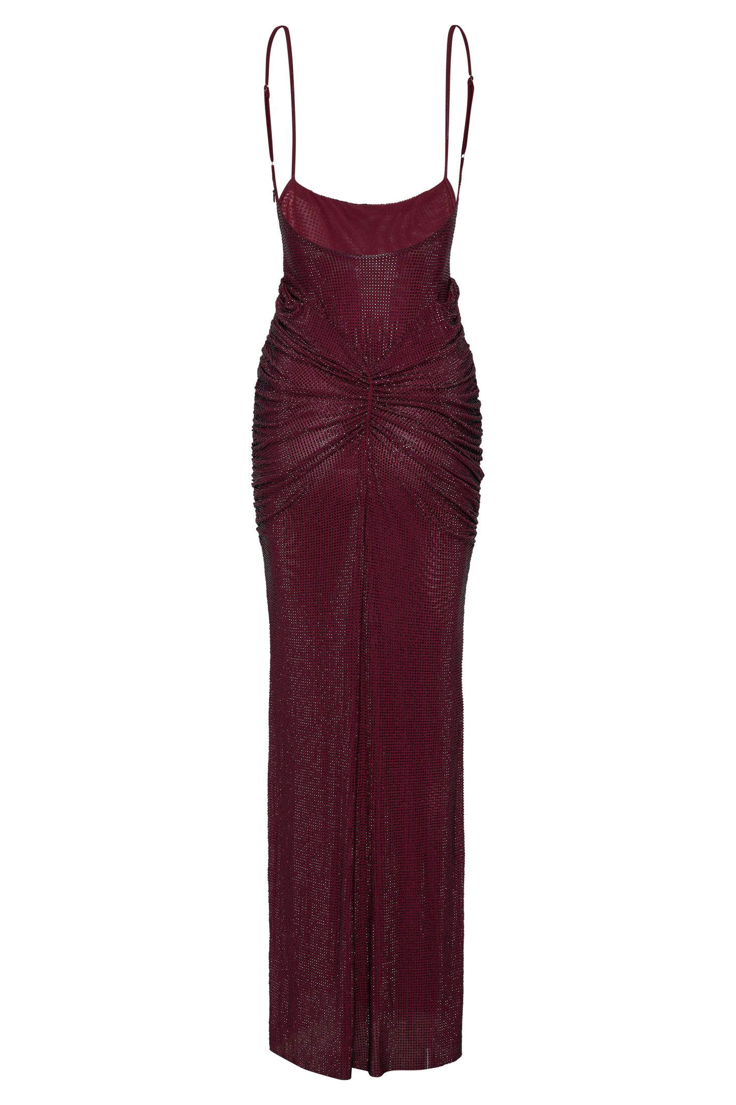 Kristal Taşlı Drapeli İp Askılı Maksi Bordo Tasarım Elbise (DA0003015)