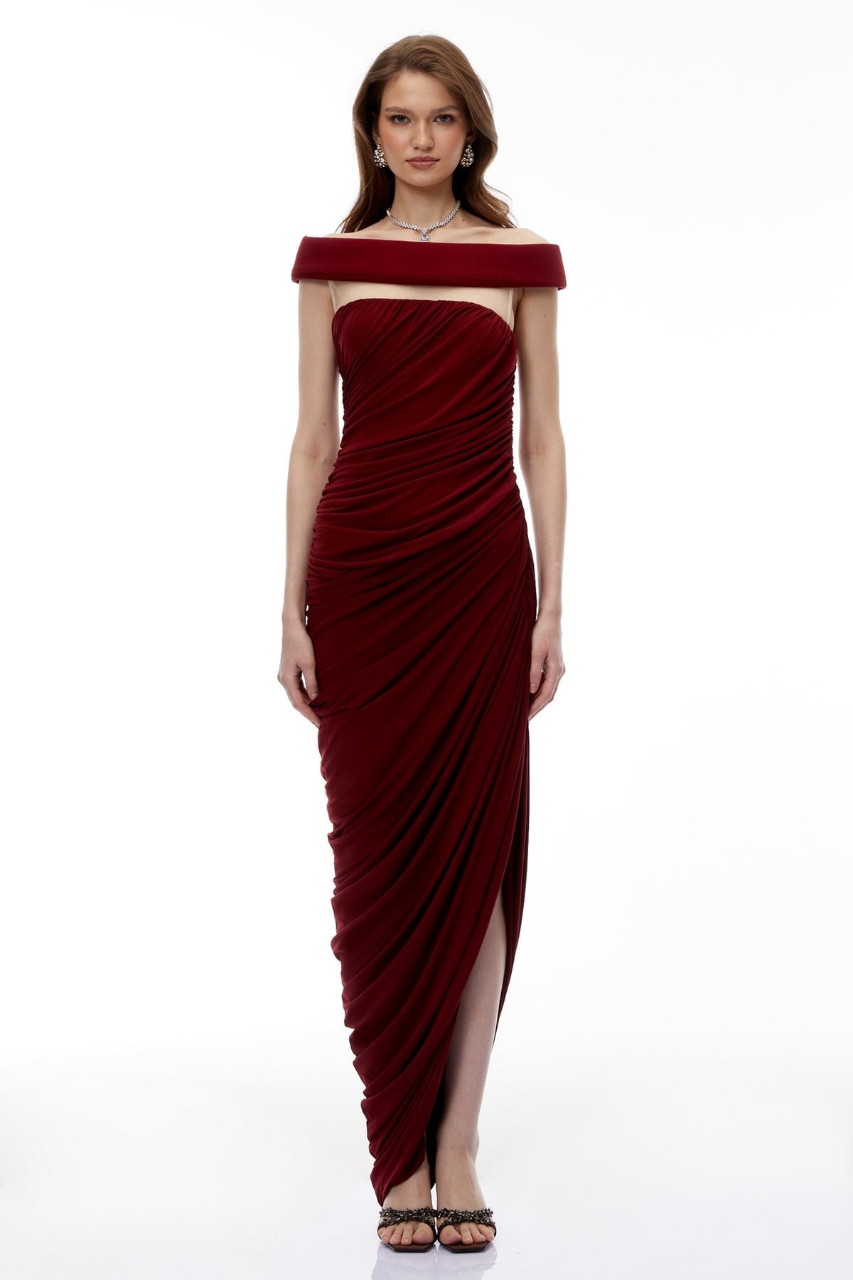 Omzu Şerit Detaylı Transparan Tüllü Pencereli Full Drape Bordo Elbise (DA0003617)