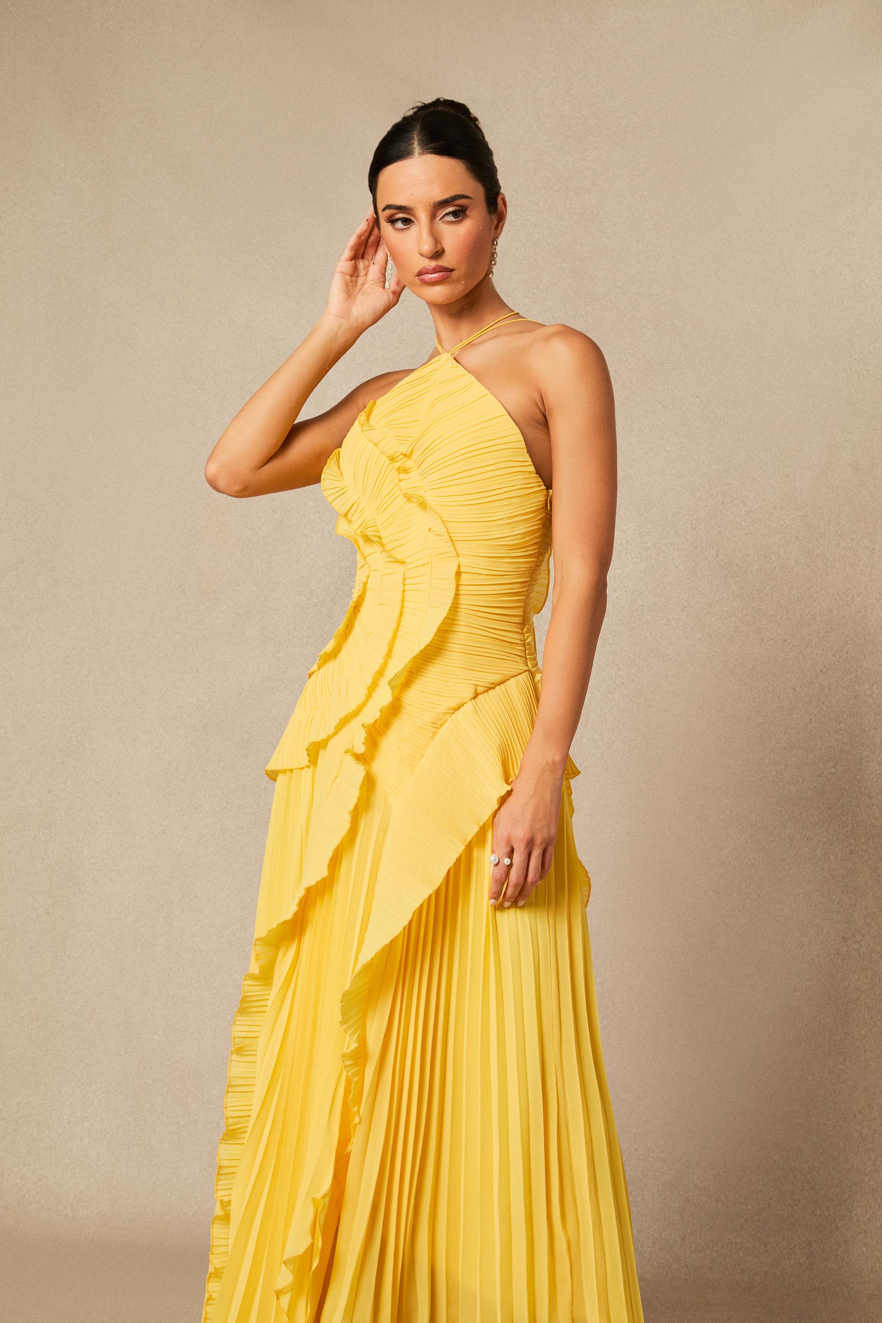 Özel Pliseli Boyundan Bağlı Sarı Tasarım Midi Elbise (DA0003017)