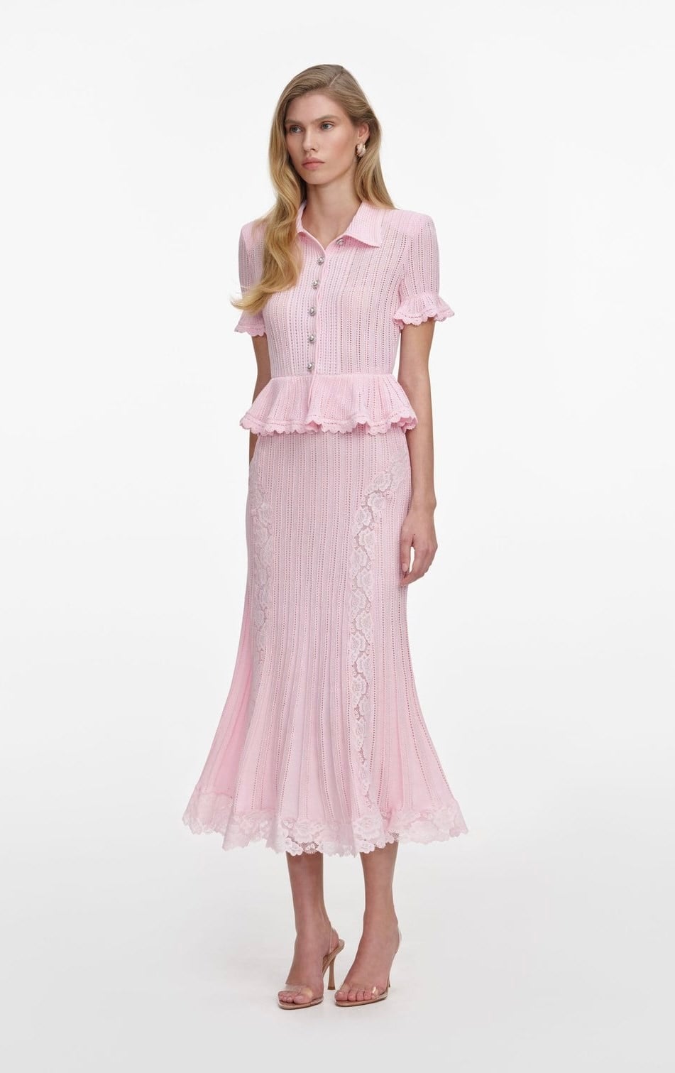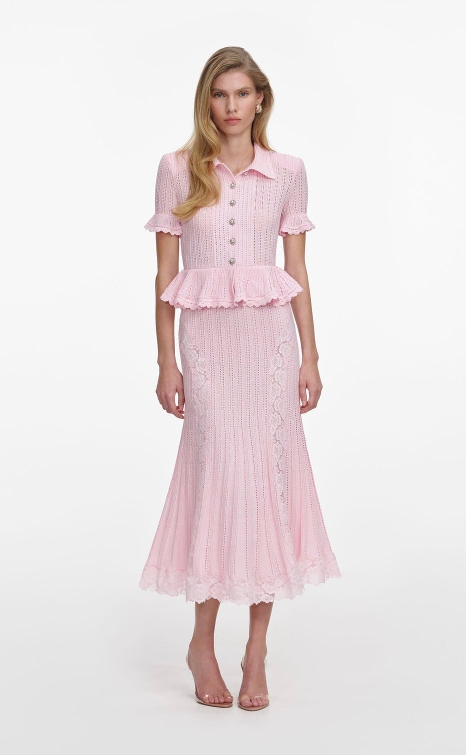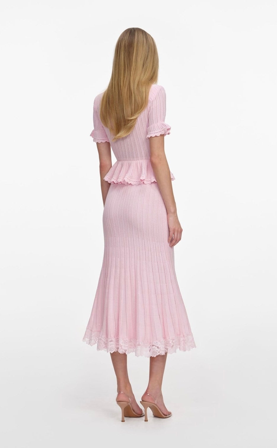 Peplum Detaylı Dantel Geçişli Pembe Triko Midi Tasarım Elbise (DA0003637)