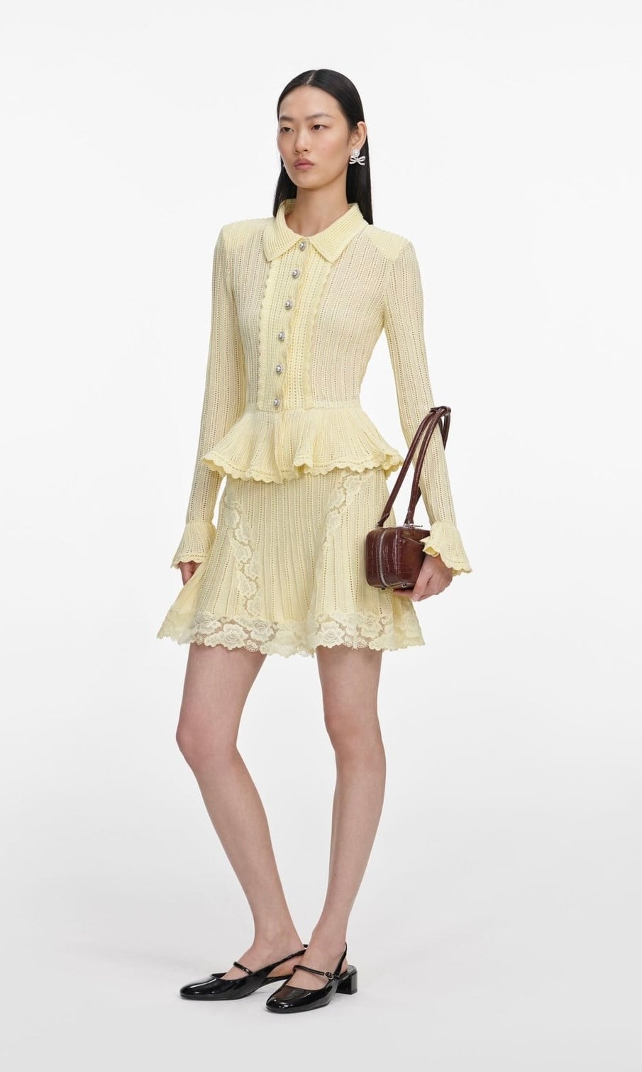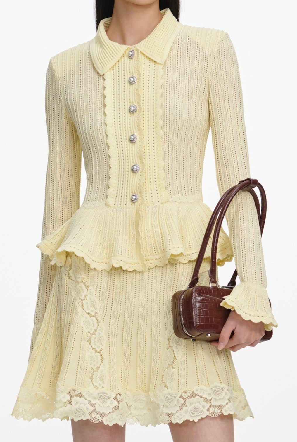 Peplum Detaylı Dantel Geçişli Sarı Triko Mini Tasarım Elbise (DA0003636)